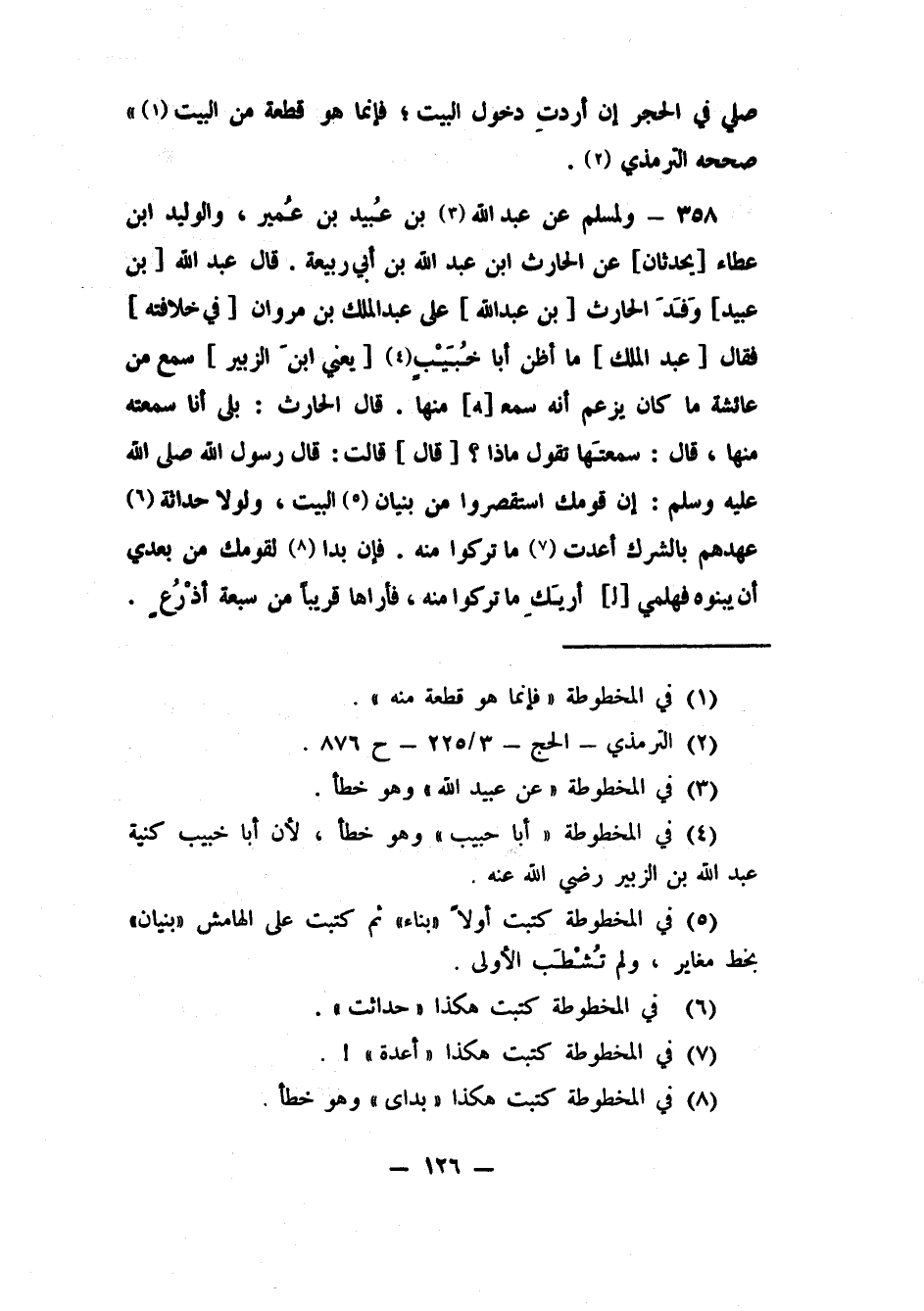 358- ولمسلم عن عبد الله3 بن عُبيد بن عُمير، والوليد بن عطاء [يحدثان] عن الحارث بن عبد الله بن أبي ربيعة. قال عبد الله [بن عبيد] "وَفَدَ الحارث [بن عبد الله] على عبد الملك بن مروان [في خلافته] فقال [عبد الملك] : ما أظن أبا خُبَيْبٍ4 [يعني ابنَ الزبير] سمع من عائشة ما كان بزعم أنه سمعـ[ـه] منها، قال الحارث: بلى أنا سمعته منها، قال: سمعتَها تقول ماذا؟ [قال] : قالت: قال رسول الله صلى الله عليه وسلم إن قومك استقصروا من بنيان 5 البيت، ولولا حداثة 6 عهدهم بالشرك أعدت 7 ما تركوا منه. فإن بدا 8 لقومك من بعدي أن يبنوه فهلمي [لـ] أريَكِ ما تركوا منه، فأراها قريبا من سبعة أَذْرُع ".