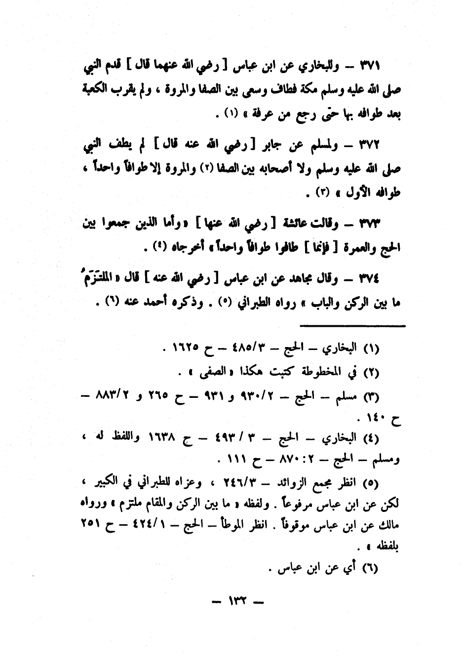 371- وللبخاري عن ابن عباس [رضي الله عنهما قال] "قدم النبي صلى الله عليه وسلم مكة فطاف وسعى بين الصفا والمروة، ولم يقرب الكعبة بعد طوافه بها حتى رجعمن عرفة"1.
