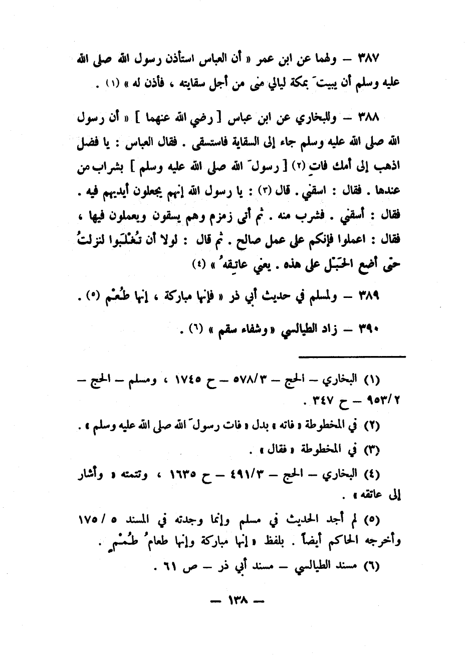 387- ولهما عن ابن عمر: "أن العباس استأذن رسول الله صلى الله عليه وسلم إن يبيت بمكة ليالي منى من أجل سقايته، فأذن له"1.