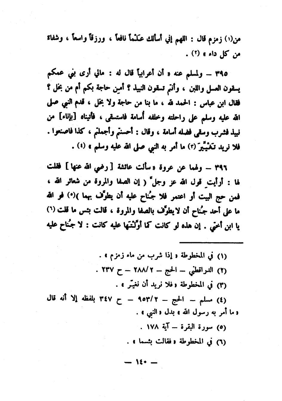 396- ولهما عن عروة: "سألت عائشة [رضي الله عنها] فقلت لها: أرأيتِ قول الله عز وجلَّ {إِنَّ الصَّفَا وَالْمَرْوَةَ مِنْ شَعَائِرِ اللَّهِ فَمَنْ حَجَّ الْبَيْتَ أَوِ اعْتَمَرَ فَلا جُنَاحَ عَلَيْهِ