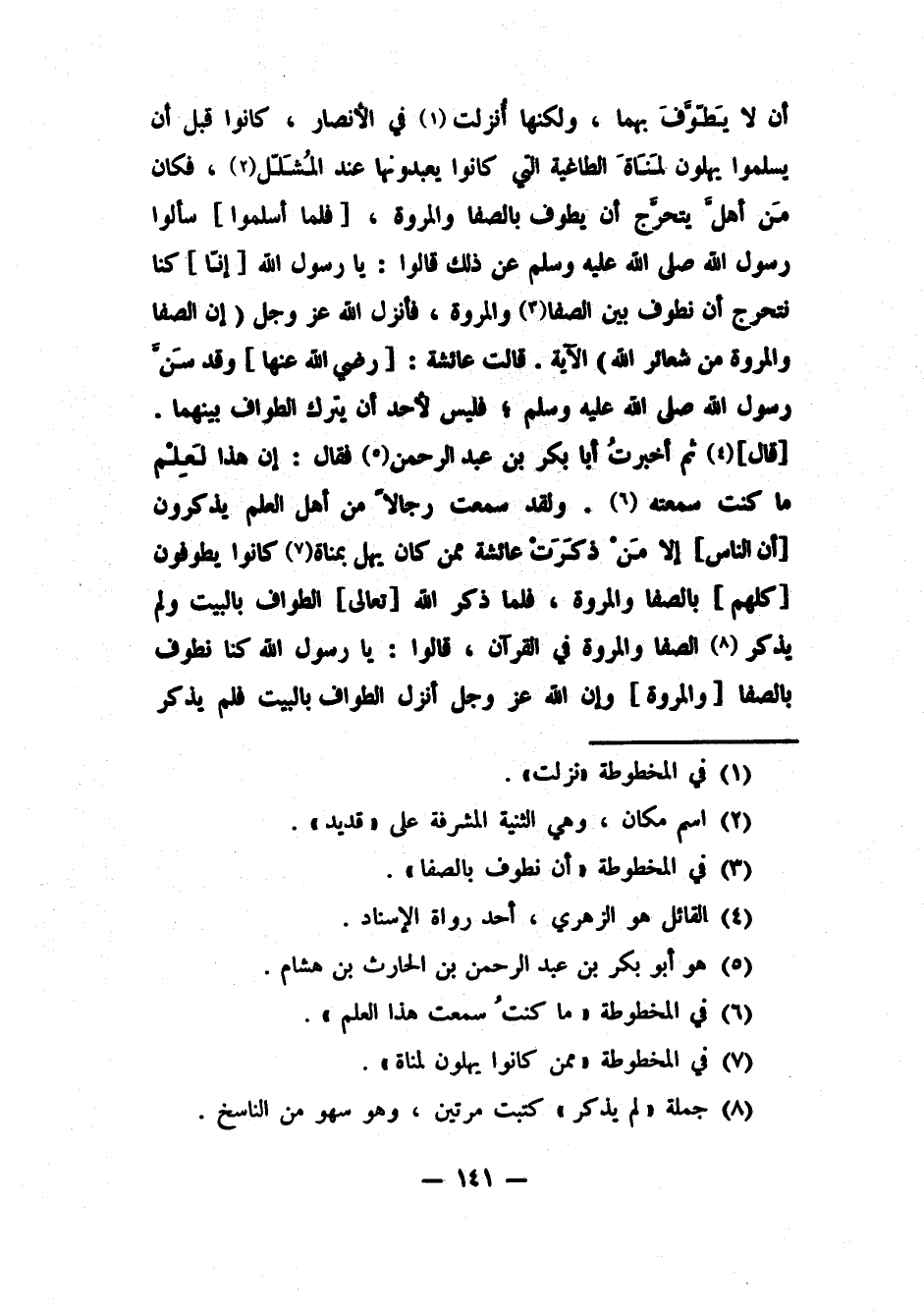أَنْ يَطَّوَّفَ بِهِمَا} 1، فوالله ما على أحد جُناح أن لا يَطَّوَّفَ بالصفا والمروة، قالت: بئس ما قلت2 يا ابن أختي. إن هذه لو كانت كما أَوَّلْتَها عليه كانت: لا جُناح عليه أن لا يطَّوَّفَ بهما، ولكنها أْنزِلت3 في الأنصار، كانوا قبل أن يسلموا يهلون لِمَنَاةَ الطاغية التي كانوا يعبدونها عند الْمُشَلَّل، 4 فكان مَنْ أَهَلَّ يتحرَّج أن يطوف بالصفا والمروة. [فلما أسلموا] سألوا رسول الله صلى الله عليه وسلم عن ذلك قالوا: يا رسول الله [إنّا] كنا نتحرج أن نطوف بين الصفا5 والمروة، فأنزل الله عز وجل {إِنَّ الصَّفَا وَالْمَرْوَةَ مِنْ شَعَائِرِ اللَّهِ} الآية. قالت عائشة [رضي الله عنها] : وقد سَنَّ رسول الله صلى الله عليه وسلم، فليس لأحد أن يترك الطواف بينهما. [قال] 6: ثم أخبرتُ أبا بكر بن عبد الرحمن7 فقال: إن هذا لَعِلْمٌ ما كنت سمعته.8 ولقد سمعت رجالاً من أهل العلم يذكرون [أن الناس] إلا مَنْ ذَكَرَتْ عائشة ممن كان يهل بمناة9 كانوا يطوفون [كلهم] بالصفا والمروة، فلما ذكر الله [تعالى] الطواف بالبيت ولم يذكر10 الصفا والمروة في القرآن، قالوا: يا رسول الله كنا نطوف بالصفا [والمروة] وإن الله عز وجل أنزل الطواف بالبيت فلم يذكر