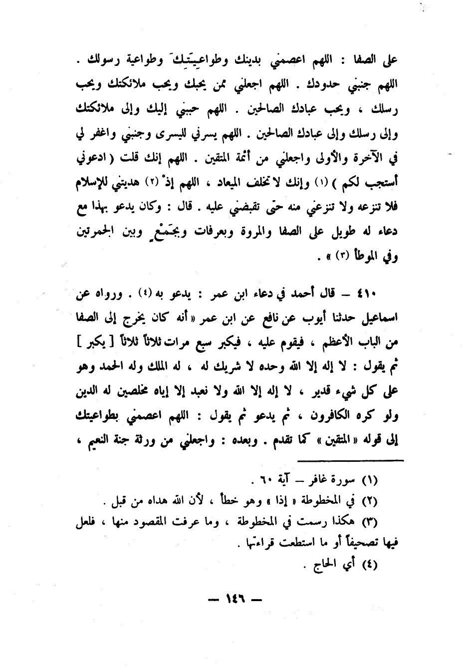 على الصفا: اللهم اعصمني بدينك وطواعِيَتِكَ وطواعية رسولك. اللهم جنبني حدودك. اللهم اجعلني ممن يحبك ويحب ملائكتك ويحب رسلك، ويحب عبادك الصالحين. اللهم حببني إليك وإلى ملائكتك وإلى رسلك وإلى عبادك الصالحين. اللهم يسرني لليسرى وجنبني العسرى واغفر لي في الآخرة والأولى واجعلني من أئمة المتقين، اللهم إنك قلت {ادْعُونِي أَسْتَجِبْ لَكُمْ} 1، وإنك لا تخلف الميعاد، اللهم إذْ2 هديتني للإسلام فلا تنْزعه ولا تنْزعني منه حتى تقبضني عليه. قال: وكان يدعو بهذا مع دعاء له طويل على الصفا والمروة وبعرفات وبِجَمْعٍ وبين الجمرتين" وفي الموطأ3.