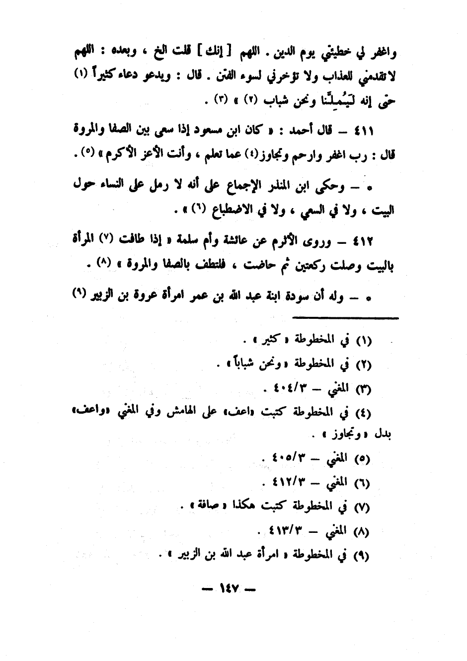 411- قال أحمد: "كان ابن مسعود إذا سعى بين الصفا والمروة قال: رب اغفر وارحم وتجاوز4 عما تعلم، وأنت الأعز الأكرم"5 - وحكى ابن المنذر الإجماع على أنه لا رمل على النساء حول البيت ولا في السعي، ولا في الاضطباع6.