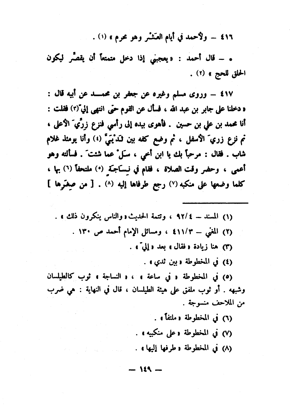416- ولأحمد في أيام العَشْر وهو محرم.1 - قال أحمد: يعجبني إذا دخل متمتعاً أن يقصِّر ليكون الحلق للحج 2.