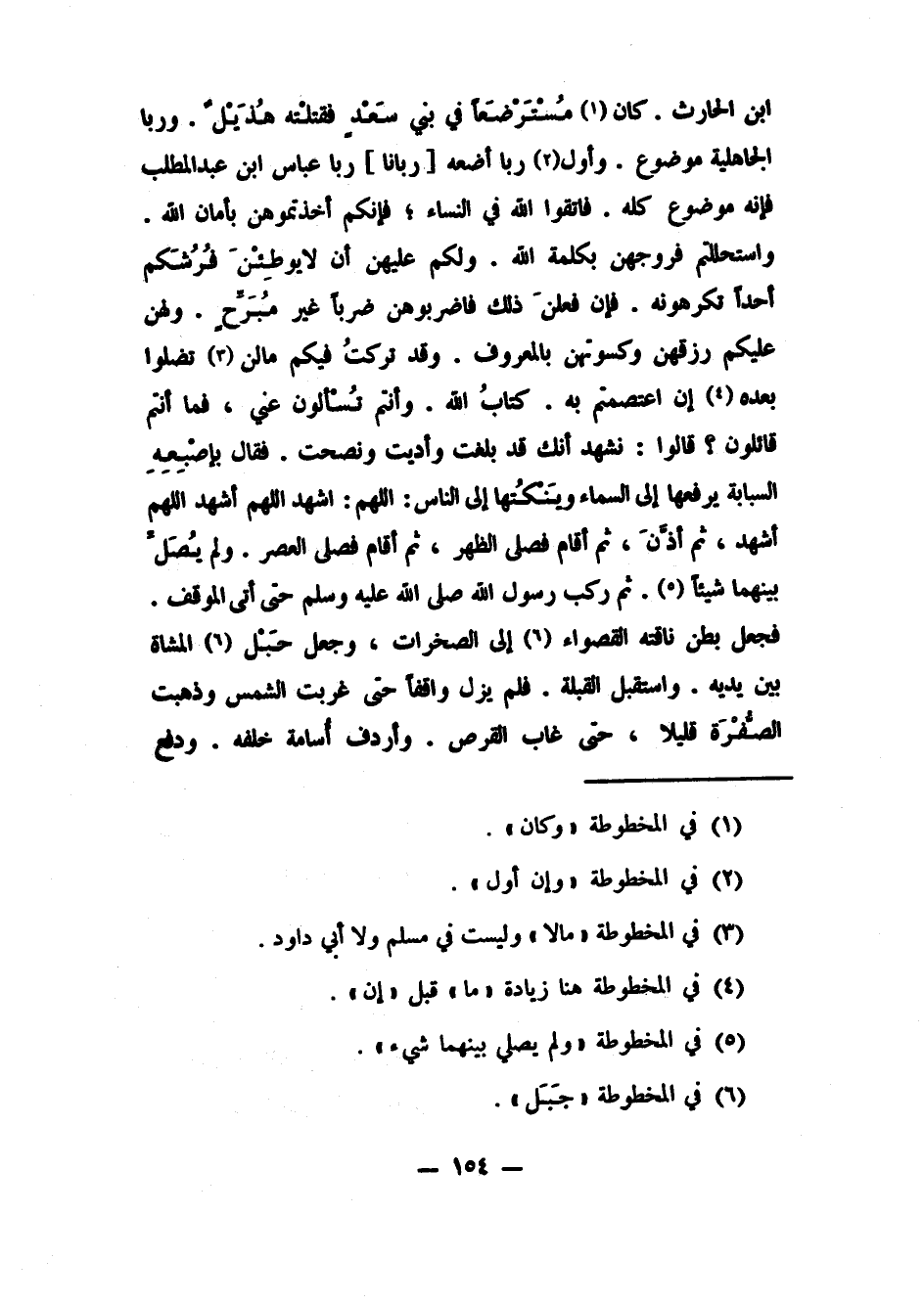 ابن الحارث. كان1 مُسْتَرْضَعاً في بني سَعْدٍ فَقَتَلَتْهُ هُذَيْلٌ. وربا الجاهلية موضوع. وأول2 ربا أضعه [ربانا] ربا عباس بن عبد المطلب؛ فإنه موضوع كله. فاتقوا الله في النساء; فإنكم أخذتموهن بأمان الله. واستحللتم فروجهن بكلمة الله. ولكم عليهن أن لا يوطِئْنَ فُرُشَكم أحداً تكرهونه. فإن فعلنَ ذلك فاضربوهن ضرباً غير مُبَرِّح. ولهن عليكم رزقهن وكسوتهن بالمعروف. وقد تركتُ فيكم ما لن 3 تضلوا بعده 4 إن اعتصمتم به: كتابُ الله. وأنتم تُسْأَلُون عني، فما أنتم قائلون؟ قالوا: نشهد أنك قد بلغت وأديت ونصحت. فقال بإصْبِعِهِ السبابة يرفعها إلى السماء وَيَنْكُتُها إلى الناس: اللهم اشهد، اللهم أشهد، اللهم أشهد، ثم أذَّن، ثم أقام فصلى الظهر، ثم أقام فصلى العصر. ولم يُصَلِّ بينهما شيئاً.5 ثم ركب رسول الله صلى الله عليه وسلم حتى أتى الموقف. فجعل بطن ناقته القصواء6 إلى الصخرات، وجعل حَبْل7 المشاة بين يديه. واستقبل القبلة. فلم يزل واقفاً حتى غربت الشمس وذهبت الصُّفْرَة قليلا، حتى غاب القرص. وأردف أسامة خلفه. ودفع