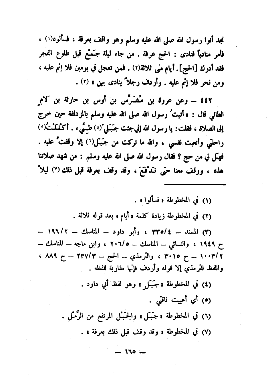 442- وعن عروة بن مُضَرِّس بن أوس بن حارثة بن لامٍ الطائي قال: "أتيتُ رسول الله صلى الله عليه وسلم بالمزدلفة حين خرج إلى الصلاة، فقلت: يا رسول الله إني جئت جَبَلَيْ4 طِيِّء. أَكْلَلْتُ5 راحلتي وأتعبت نفسي، والله ما تركت من جَبْل6 إلا وقفتُ عليه. فهَل لي من حج؟ فقال رسول الله صلى الله عليه وسلم: من شهد صلاتنا هذه، ووقف معنا حتى نَدْفَعَ، وقد وقف بعرفة قبل ذلك 7 ليلاً