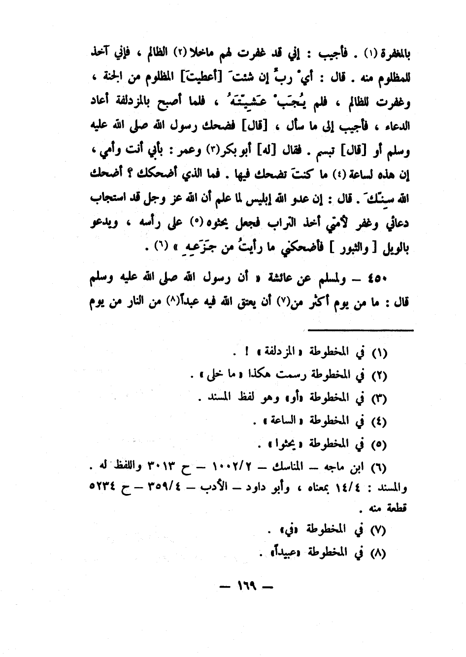 450- ولمسلم عن عائشة: "أن رسول الله صلى الله عليه وسلم قال: ما من يوم أكثر من 7 أن يعتق الله فيه عبداً 8 من النارمن يوم