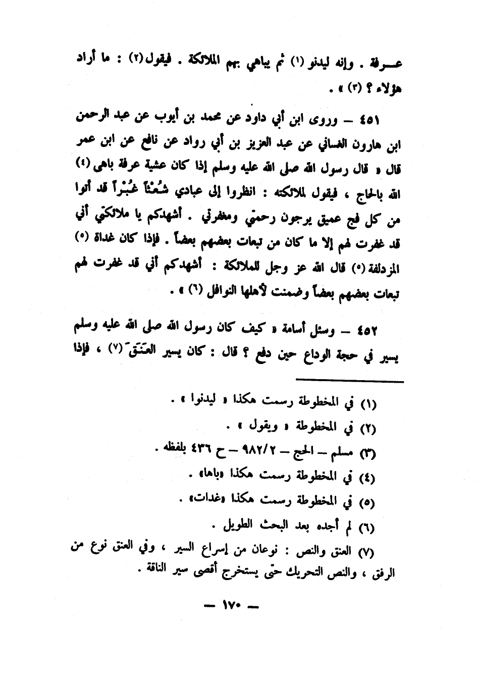 452- وسئل أسامة: "كيف كان رسول الله صلى الله عليه وسلم يسير في حجة الوداع حين دفع؟ قال: كان يسير العنق، 8 فإذا