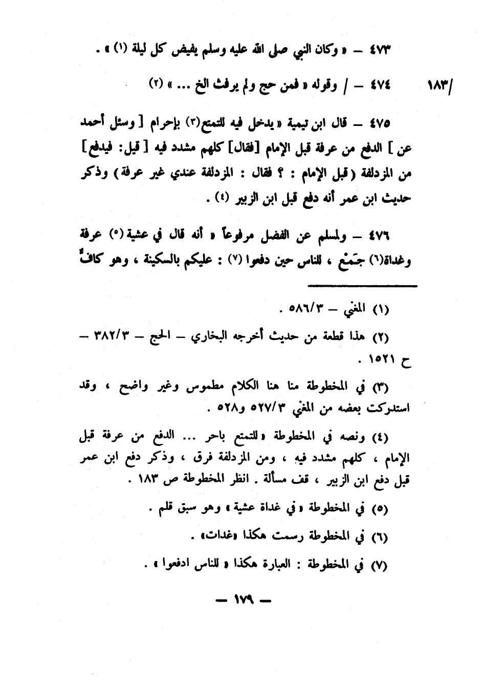 4 ونصه في المخطوطة للتمتع باحر ... الدفع من عرفة قبل الإمام, كلهم مشدد فيه, ومن المزدلفة فرق, وذكر دفع ابن عمر قبل دفع ابن الزبير, قف مسألة. انظر المخطوطة ص 183.