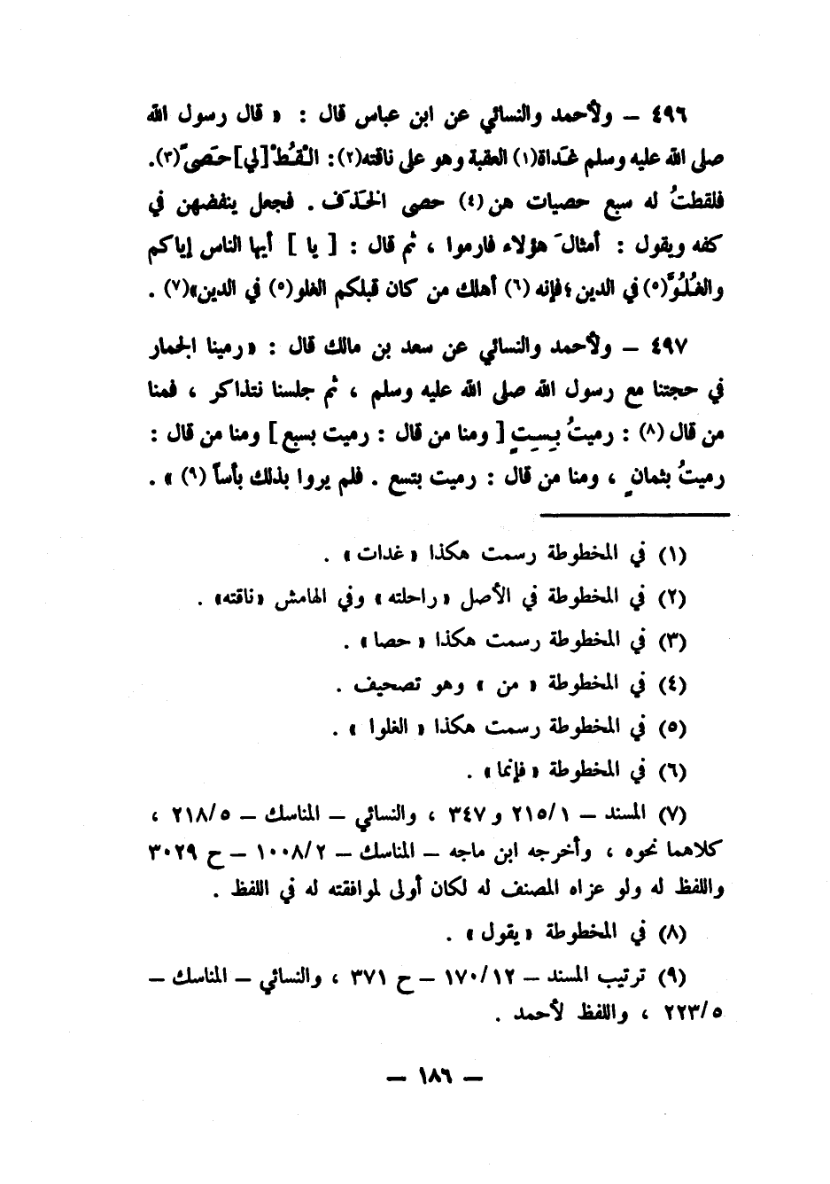 496- ولأحمد والنسائي عن ابن عباس قال: "قال رسول الله صلى الله عليه وسلم غداة1 العقبة وهو على ناقته2: الْقُطْ [لي] حَصىً 3، فلقطتُ له سبع حصيات هن4 حصى الخَذْف، فجعل ينفضهن في كفه ويقول: أمثالَ هؤلاء فارموا، ثم قال: [يا] أيها الناس إياكم والْغُلُوّ 5 في الدين؛ 6 فإنه أهلك من كان قبلكم الغلو 7 في الدين" 8.