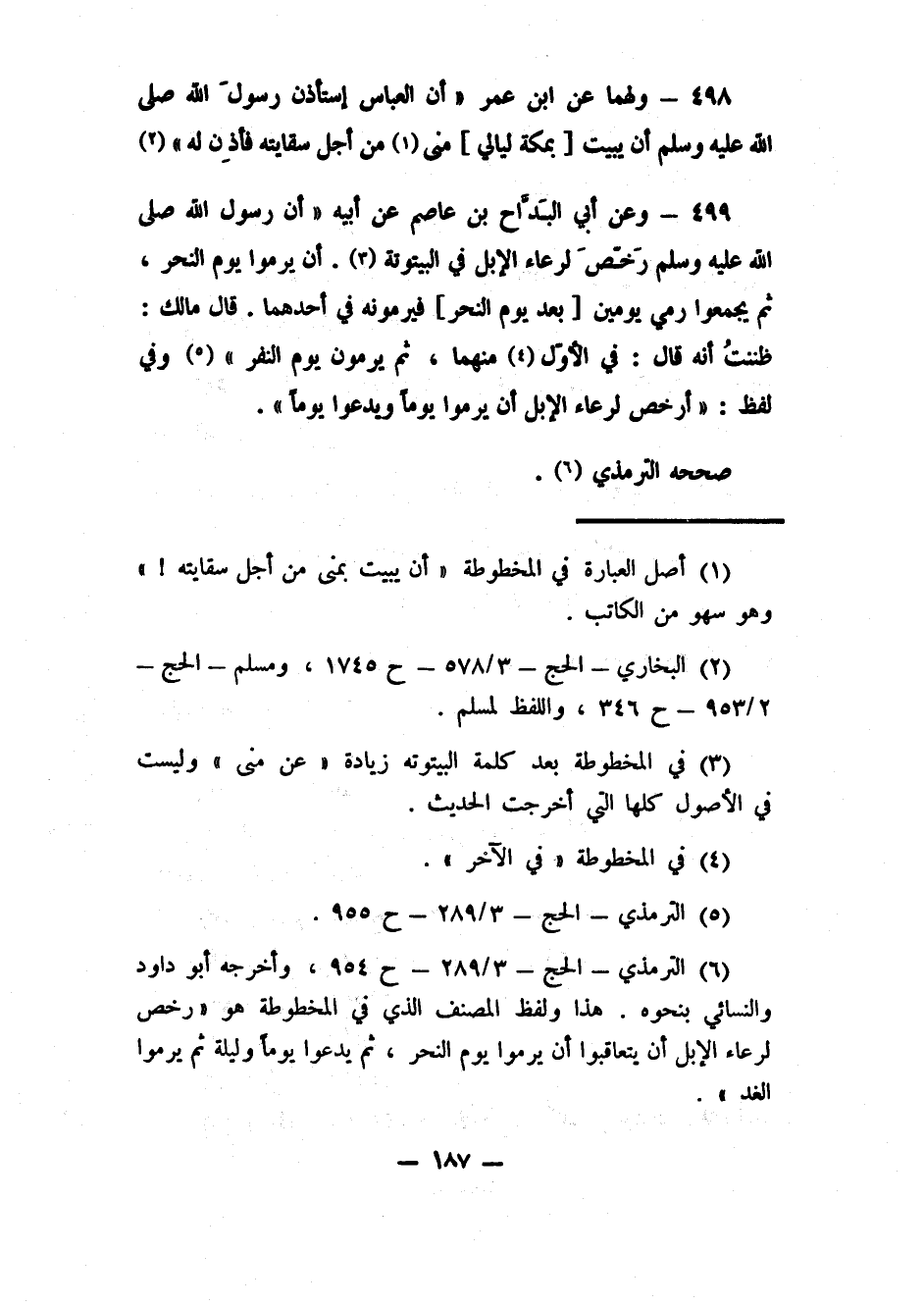 3 في المخطوطة بعد كلمة "البيتوتة" زيادة "عن منى"، وليست في الأصول كلها التي أخرجت الحديث.