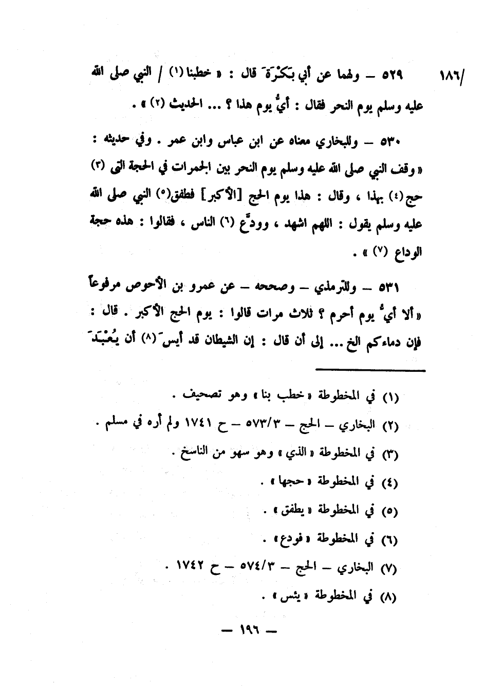 531- وللترمذي – وصححه - عن عمرو بن الأحوص مرفوعاً: "ألا أيُّ يوم أحرم؟ ثلاث مرات قالوا: يوم الحج الأكبر. قال: فإن دماءكم الخ ... إلى أن قال: إن الشيطان قد أيسَ 8 أن يُعْبَدَ