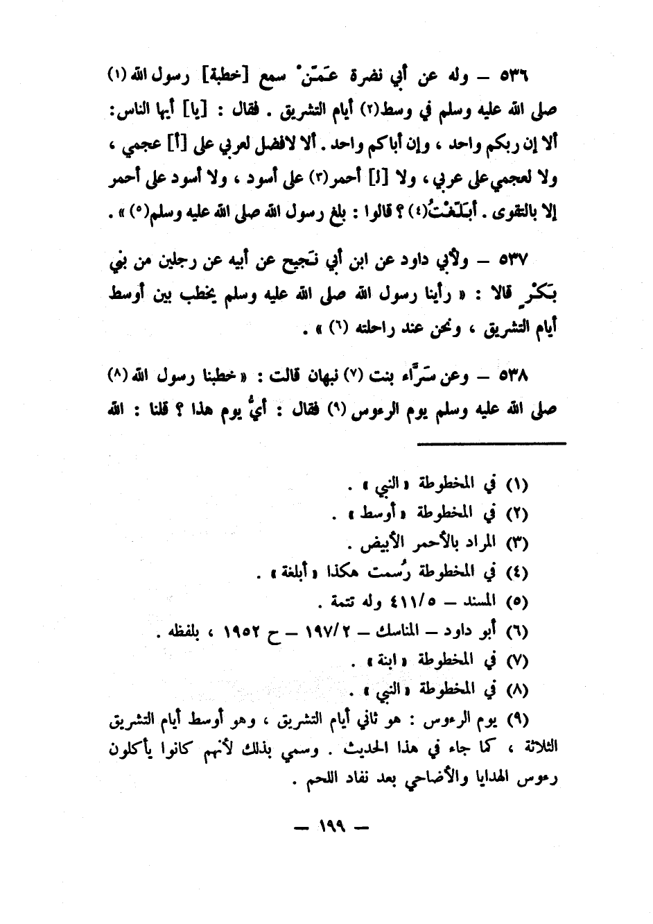 536- وله عن أبي نضرة عَمّنْ سمع [خطبة] رسول الله1 صلى الله عليه وسلم في وسط2 أيام التشريق. فقال: " [يا] أيها الناس: ألا إن ربكم واحد، وإن أباكم واحد. ألا لا فضل لعربي على [أ] عجمي، ولا لعجمي على عربي، ولا [لـ] أحمر 3 على أسود، ولا أسود على أحمر إلا بالتقوى. أبلَّغْتُ 4؟ قالوا: بلغ رسول الله صلى الله عليه وسلم"5.