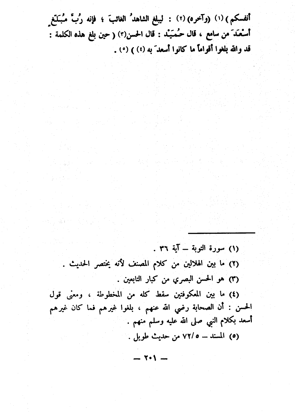 أَنْفُسَكُمْ} 1 (وآخره) 2 ليبلغ الشاهد الغائب; فإنه رُبَّ مُبَلَّغٍ أَسْعَد من سامع" قال حُمَيْد: قال الحسن3: حين بلغ هذه الكلمة: قد والله بلغوا أقواماً ما كانوا أسعدَ به 4 5.