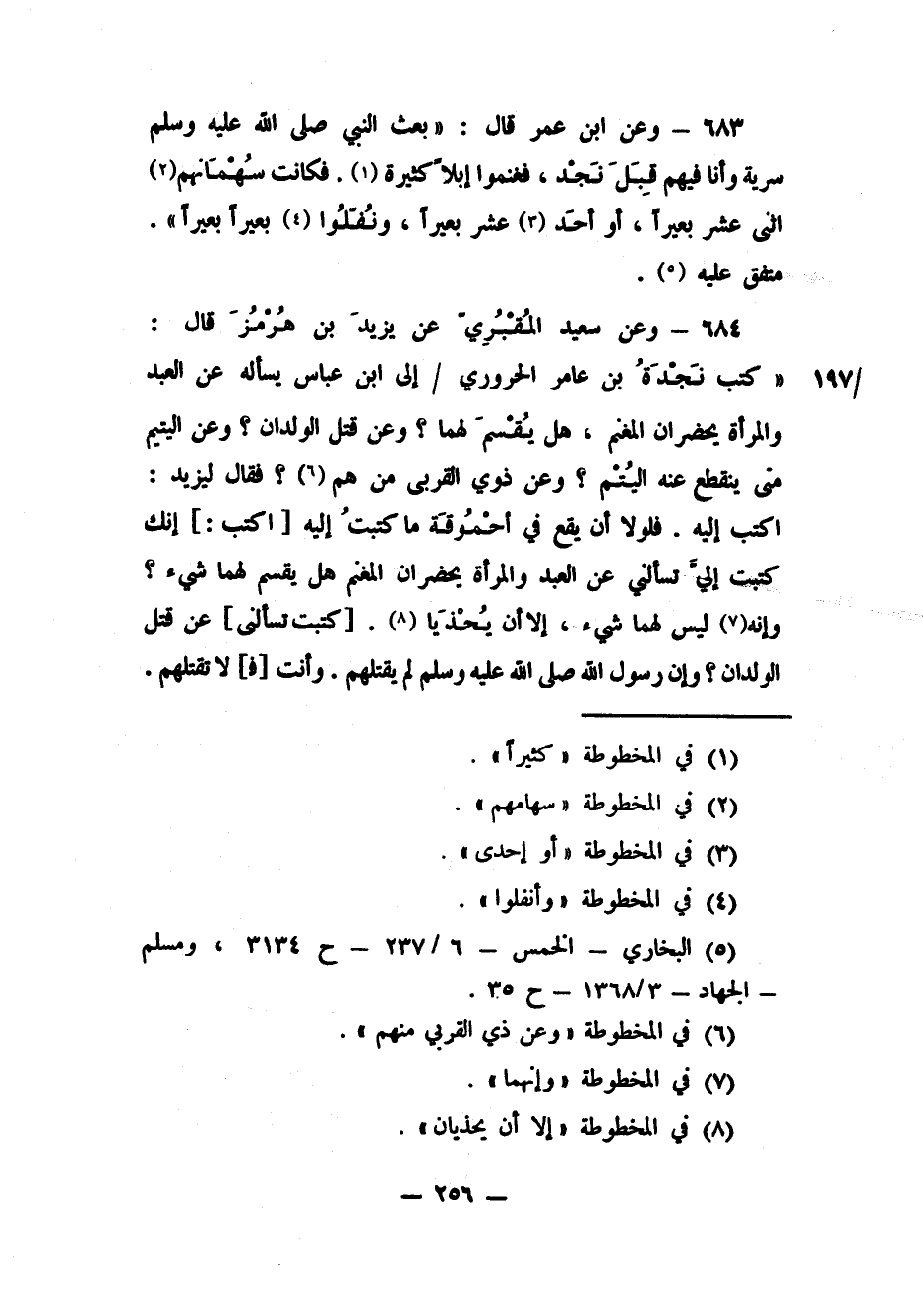684- وعن سعيد المُقْبُرِيّ عن يزيدَ بن هُرْمُزَ قال: "كتب نَجْدَةُ بن عامر الحروري إلى ابن عباس يسأله عن العبد والمرأة يحضران المغنم هل يُقْسَمُ لهما؟ وعن قتل الولدان؟ وعن اليتيم متى ينقطع عنه اليُتْم؟ وعن ذوي القربى من هم6؟ فقال ليزيد: اكتب إليه. فلولا أن يقع في أحْمُوقَة ما كتبتُ إليه [اكتب:] إنك كتبت إلَيَّ تسألني عن العبد والمرأة يحضران المغنم هل يقسم لهما شيء؟ وإنه7 ليس لهما شيء، إلا أن يُحْذَيا8. [كتبت تسألني] عن قتل الولدان؟ وإن رسول الله صلى الله عليه وسلم لم يقتلهم. وأنت [فـ] لا تقتلهم