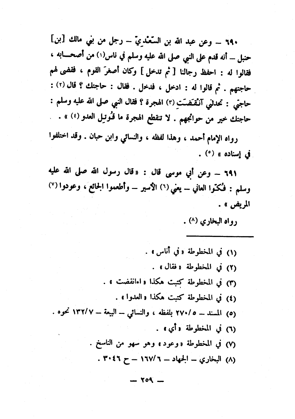 690- وعن عبد الله بن السّعْدِيّ - رجل من بني، مالك [بن] حنبل - "أنه قدم على النبي صلى الله عليه وسلم في ناس1 من أصحابه، فقالوا له: احفظ رحالنا [ثم تدخل] وكان أصغرَ القوم، فقضى لهم حاجتهم. ثم قالوا له: ادخل، فدخل. فقال: حاجتك؟ قال2: حاجتي تحدثني آنْقَضَتِ3 الهجرة؟ فقال النبي صلى الله عليه وسلم: حاجتك خير من حوائجهم. لا تنقطع الهجرة ما قُوتِل العدو 4 " رواه الإمام أحمد، وهذا لفظه، والنسائي وابن حبان. وقد اختلفوا في إسناده5.