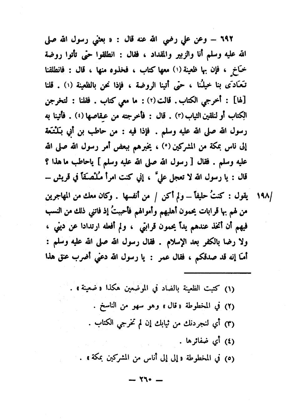692- وعن علي رضي الله عنه قال: "بعثني رسول الله صلى الله عليه وسلم أنا والزبير والمقداد، فقال: انطلقوا حتى تأتوا روضة خَاخٍ، فإن بها ظعينة1 معها كتاب، فخذوه منها، قال: فانطلقنا تَعَادَى بنا خيلُنا، حتى أتينا الروضة، فإذا نحن بالظعينة2. قلنا [لها] : أخرجي الكتاب. قالت3 ما: معي كتاب. فقلنا: لتخرجن الكتاب أو لنلقين الثياب4. قال: فأخرجته من عِقاصها5. فأتينا به رسول الله صلى الله عليه وسلم، فإذا فيه: من حاطب بن أبي بَلْتَعَة إلى ناس بمكة من المشركين6 يخبرهم ببعض أمر رسول الله صلى الله عليه وسلم. فقال [رسول الله صلى الله عليه وسلم] : يا حاطب ما هذا؟ قال: يا رسول الله لا تعجل علَيَّ، إني كنت امرأ مُلْصَقاً في قريش - يقول: كنتُ حليفاً - ولم أكن من أنفسها. وكان معك من المهاجرين من لهم بها قرابات يحمون أهليهم وأموالهم فأحببتُ إذ فاتني ذلك من النسب فيهم أن أتخذ عندهم يداً يحمون قرابتي، ولم أفعله ارتدادا عن ديني، ولا رضى بالكفر بعد الإسلام. فقال رسول الله صلى الله عليه وسلم أمَا إنه قد صدقكم، فقال عمر: يا رسول الله دعني أضرب عنق هذا