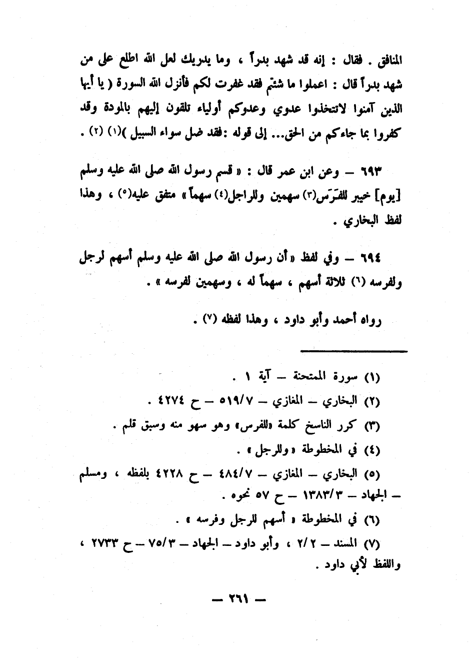 693- وعن ابن عمر قال: "قسم رسول الله صلى الله عليه وسلم [يوم] خيبر للفَرَس3 سهمين وللراجل4 سهماً" متفق عليه5، وهذا لفظ البخاري.