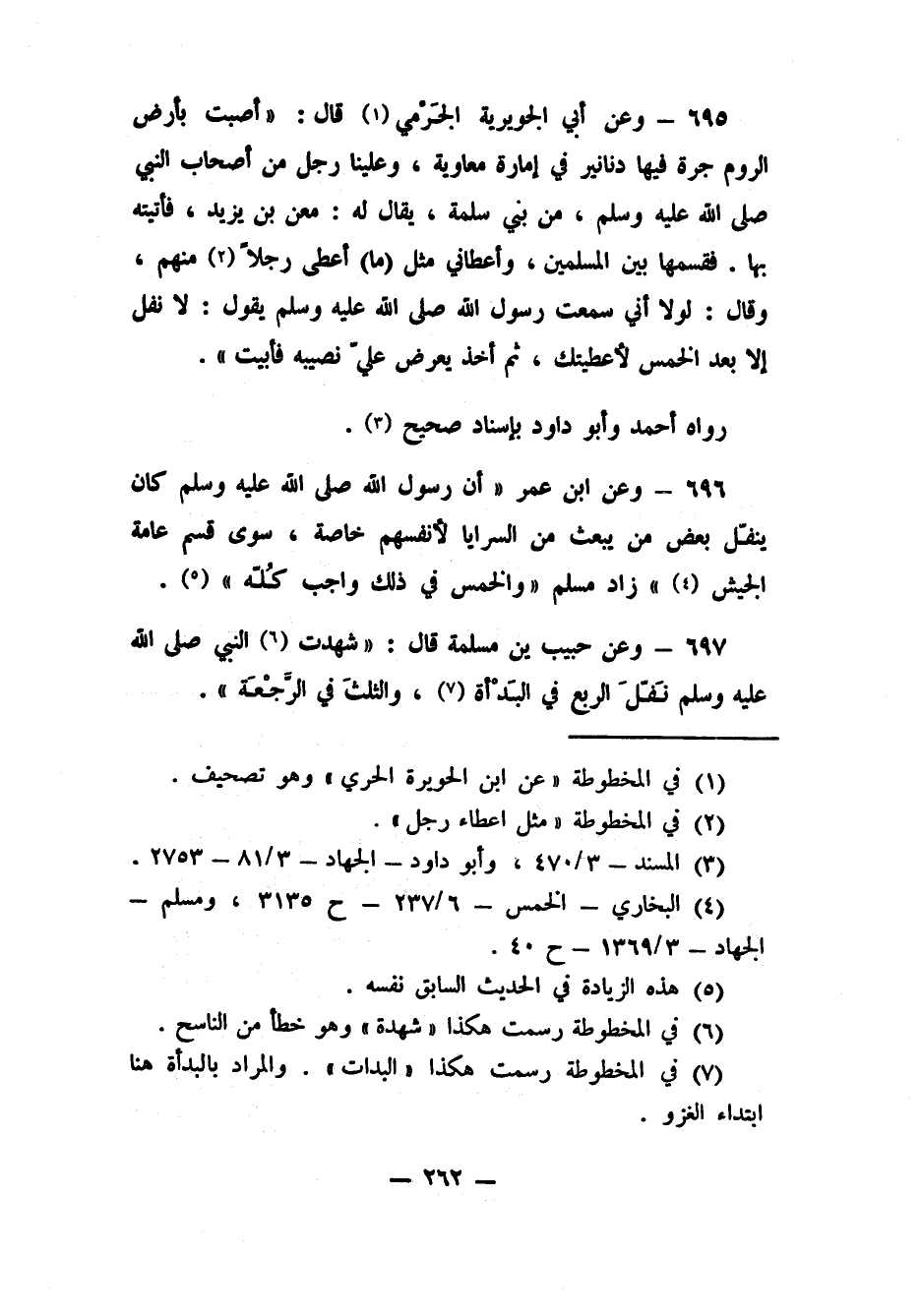 696- وعن ابن عمر: "أن رسول الله صلى الله عليه وسلم كان ينفّل بعض من يبعث من السرايا لأنفسهم خاصة، سوى قسم عامة الجيش4") زاد مسلم: "والخمس في ذلك واجب كُلّه"5.