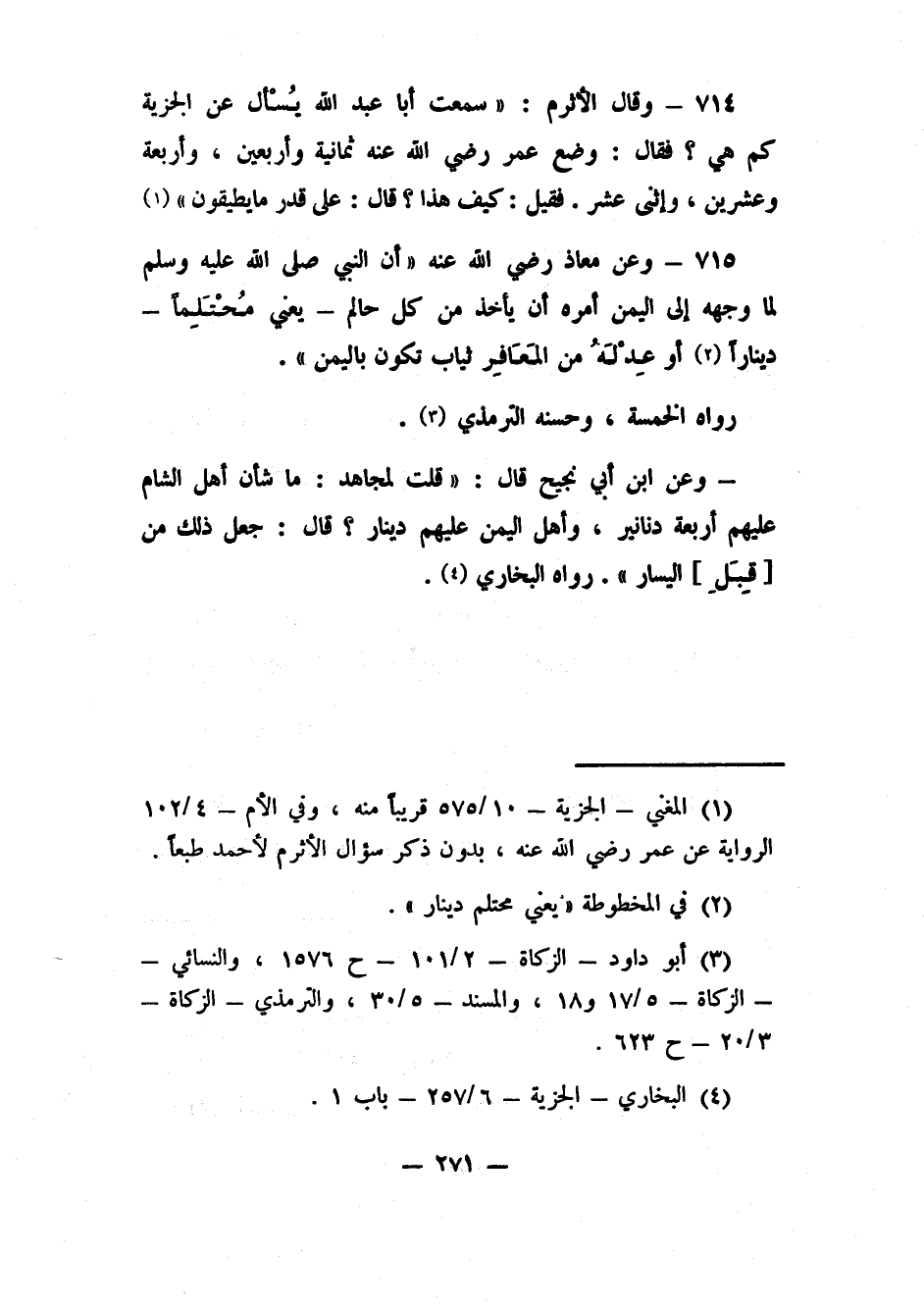 715- وعن معاذ رضي الله عنه: "أن النبي صلى الله عليه وسلم لما وجهه إلى اليمن أمره أن يأخذ من كل حالم - يعني مُحْتَلِماً - ديناراً2 أو عِدْلَهُ من الْمَعَافِرِ، ثياب تكون باليمن" رواه الخمسة، وحسنه الترمذي3.