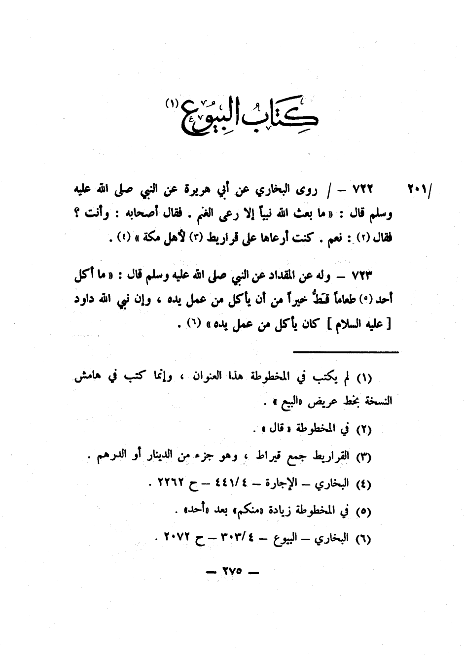722- روى البخاري عن أبي هريرة عن النبي صلى الله عليه وسلم قال: "ما بعث الله نبياً إلا رعى الغنم. فقال أصحابه: وأنت؟ فقال2: نعم. كنت أرعاها على قراريط 3 لأهل مكة" 4.