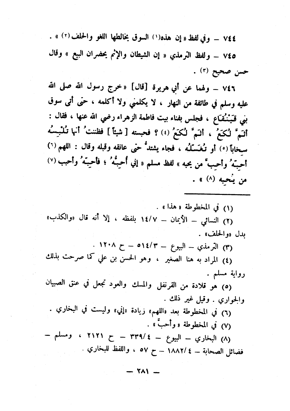 746- ولهما عن أبي هريرة [قال] : "خرج رسول الله صلى الله عليه وسلم في طائفة من النهار، لا يكلمني ولا أكلمه، حتى أتى سوق بني قَيْنُقَاع، فجلس بفناء بيت فاطمة الزهراء رضي الله عنها، فقال: أَثَمَّ لُكَعُ، أَثَمَّ لُكَعَ؟ 4 فحبسته [شيئاً] : فظننتُ أَنَّها تُلْبِسُه سِخَاباً5 أو تُغَسِّلُه، فجاء يشتدُّ حتى عانقه وقبله وقال: اللهم 6 أحِبَّهُ وأحِبَّ من يحبه " لفظ مسلم " إِنِّي أُحِبُّهُ; فَأَحِبَّهُ وَأحْبِبْ 7 مَن يُحِبُّه" 8.