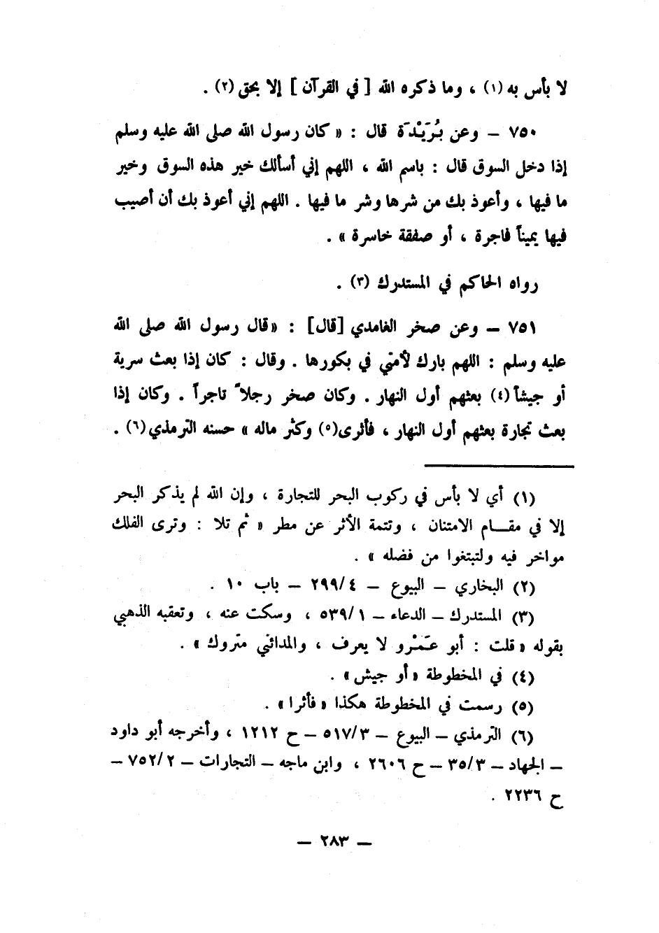750- وعن بُرَيْدَة قال: "كان رسول الله صلى الله عليه وسلم إذا دخل السوق قال: باسم الله، اللهم إني أسألك خير هذه السوق وخير ما فيها، وأعوذ بك من شرها وشر ما فيها. اللهم إني أعوذ بك أن أصيب فيها يميناً فاجرة، أو صفقة خاسرة" رواه الحاكم في المستدرك3.