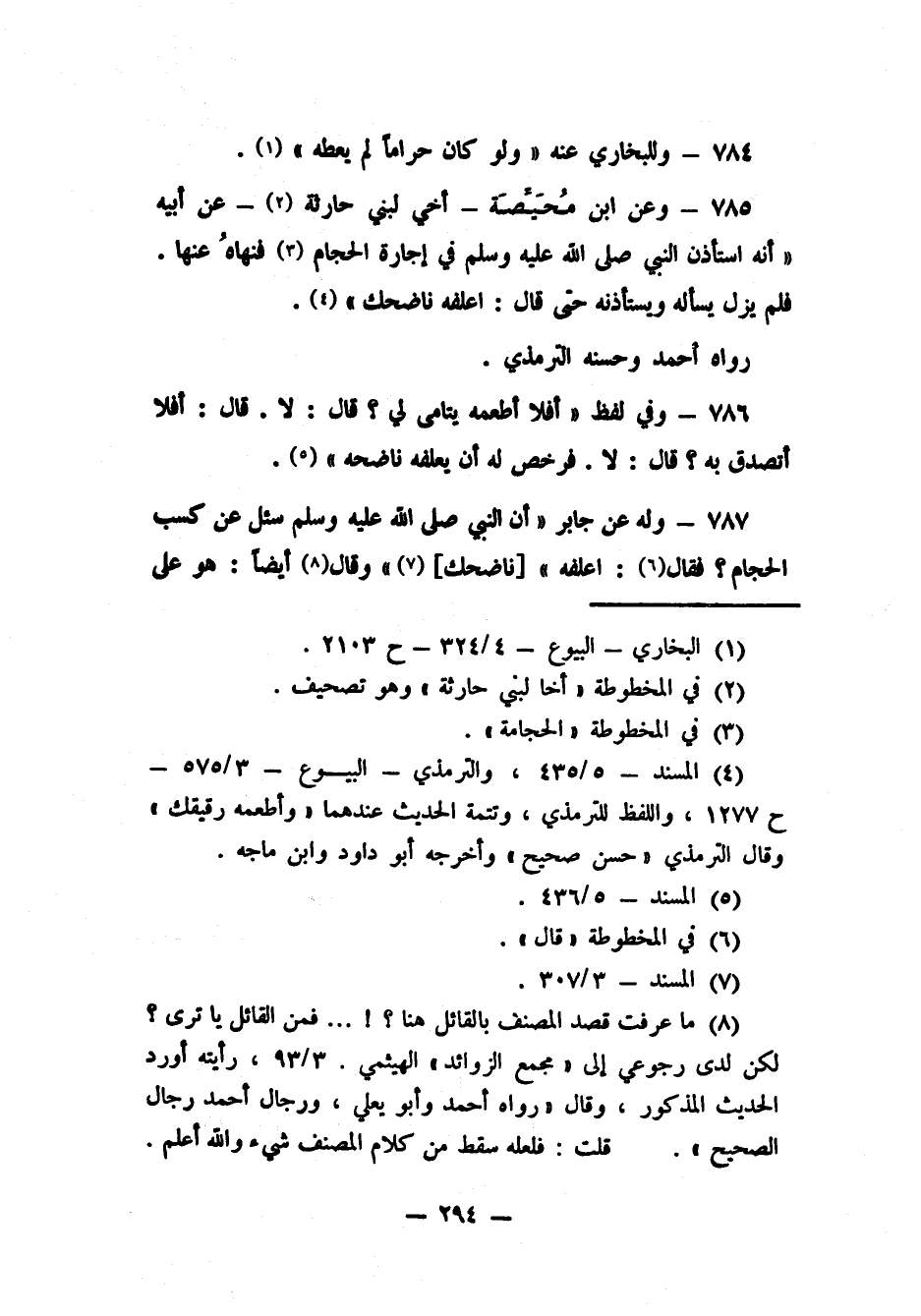785- وعن ابن مُحَيِّصة- أخي لبني حارثة2 - عن أبيه "أنه استأذن النبي صلى الله عليه وسلم في إجارة الحجام3 فنهاهُ عنها. فلم يزل يسأله ويستأذنه حتى قال: اعلفه ناضحك 4") رواه أحمد، وحسنه الترمذي.