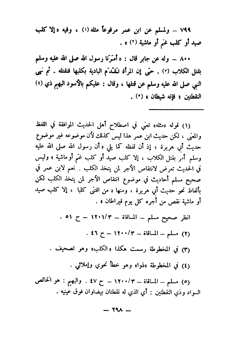 800- وله عن جابر قال: "أَمَرَنا رسول الله صلى الله عليه وسلم بقتل الكلاب3، حتى إن المرأة تَقْدَم البادية بكلبها فنقتله. ثم نهى النبي صلى الله عليه وسلم عن قتلها، وقال: عليكم بالأسود البهيم ذي 4 النقطتين; فإنه شيطان" 5.