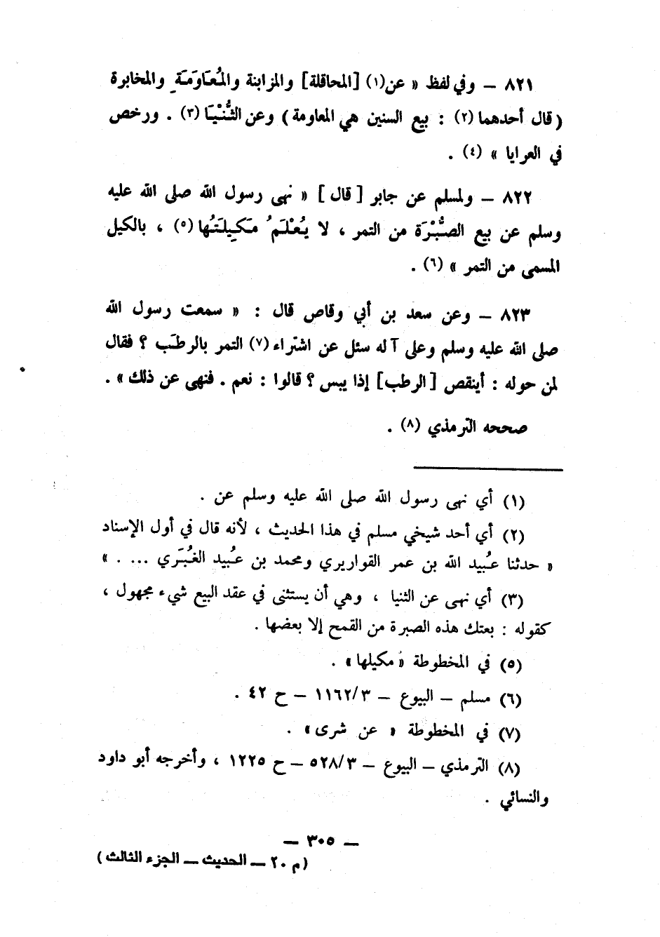 823- وعن سعد بن أبي وقاص قال: "سمعت رسول الله صلى الله عليه وسلم وعلى آله سئل عن اشتراء6 التمر بالرطَب؟ فقال لمن حوله: أينقص [الرطب] إذا يبس؟ قالوا: نعم. فنهى عن ذلك" صححه الترمذي7.