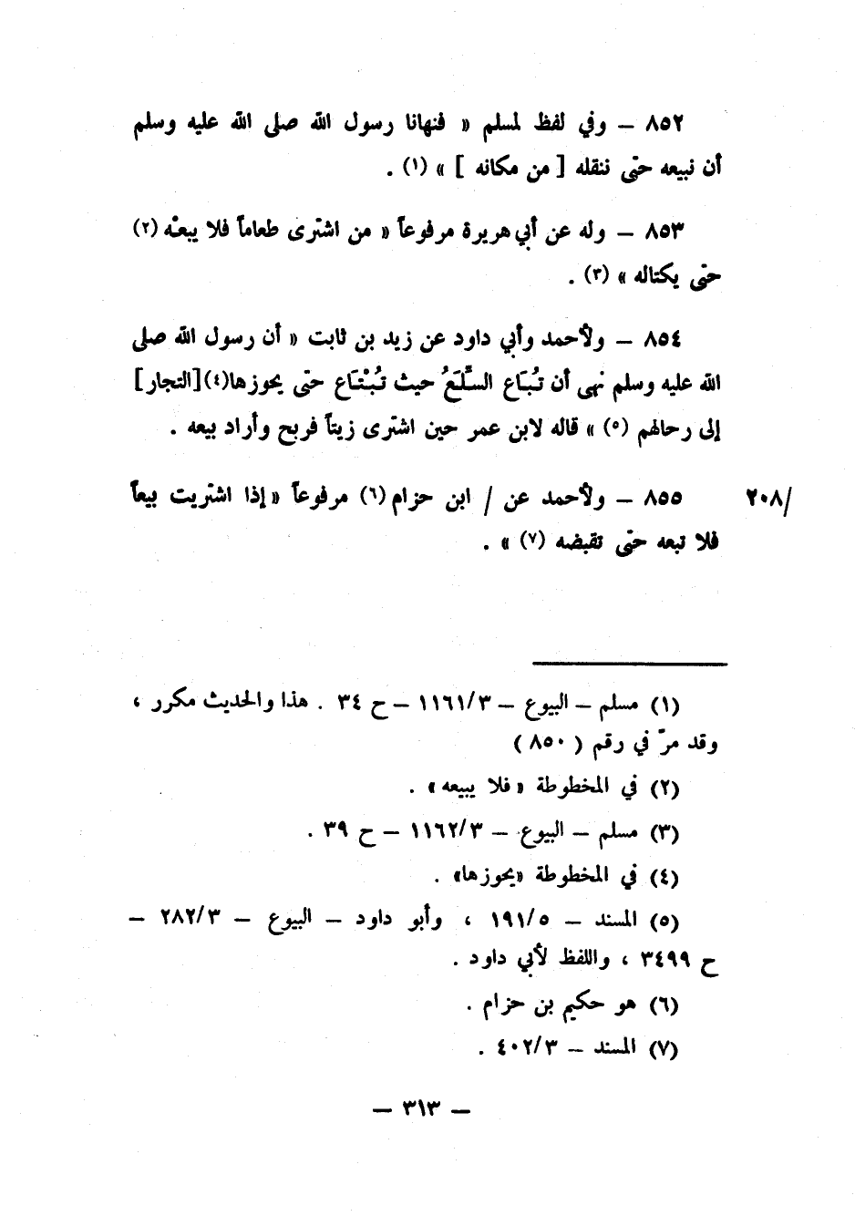 854- ولأحمد وأبي داود عن زيد بن ثابت "أن رسول الله صلى الله عليه وسلم نهى أن تُبَاعَ السِّلَعُ حيث تُبْتَاع حتى يحوزها4 [التجار] إلى رحالهم5. قاله لابن عمر حين اشترى زيتاً فربح وأراد بيعه".