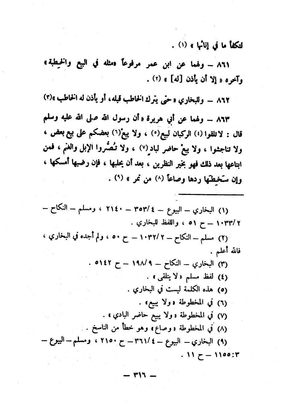 863- ولهما عن أبي هريرة: "أن رسول الله صلى الله عليه وسلم قال: لا تلقوا 4 الركبان لبيع 5، ولا يبعْ 6 بعضكم على بيع بعض، ولا تناجشوا، ولا يبعْ حاضر لبادٍ 7، ولا تصُرُّوا الإبل والغنم، فمن ابتاعها بعد ذلك فهو بخير النظرين بعد أن يحلبها، فإن رضيها أمسكها، وإن سَخِطَها ردها وصاعاً 8 من تمر" 9.