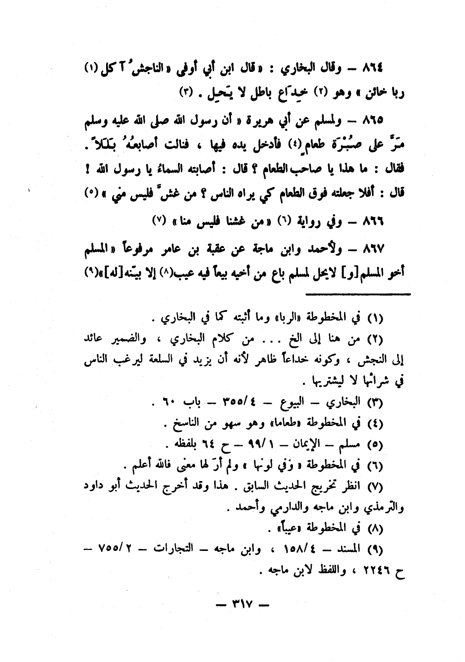 865- ولمسلم عن أبي هريرة: "أن رسول الله صلى الله عليه وسلم مَرَّ على صُبْرَة طعامٍ4 فأدخل يده فيها، فنالت أصابعُهُ بَلَلاً. فقال: ما هذا يا صاحب الطعام؟ قال: أصابته السماءُ يا رسول الله! قال: أفلا جعلته فوق الطعام كي يراه الناس؟ مَن غشَّ فليس مني" 5.