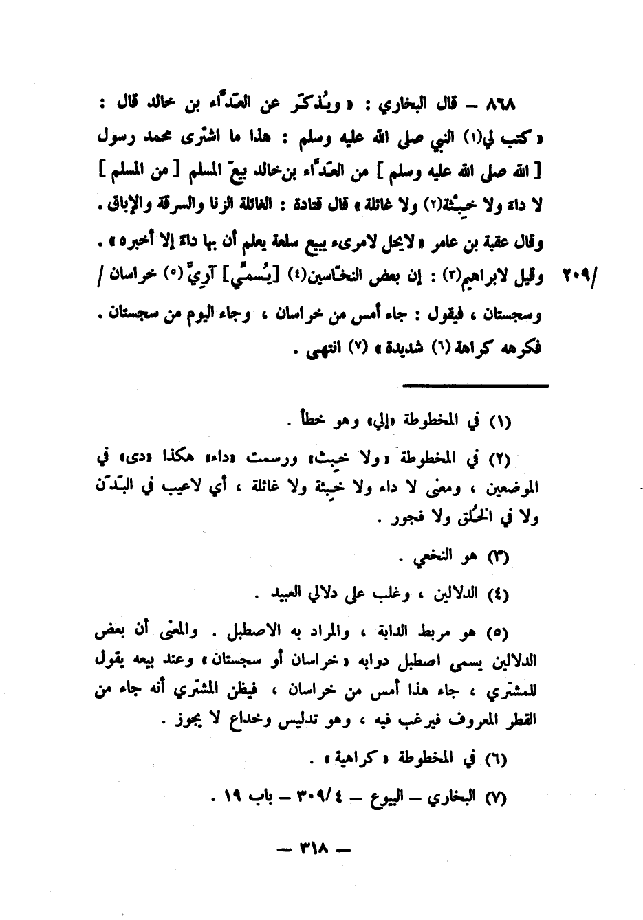 868- قال البخاري: وَيُذْكَر عن العدَّاء بن خالد قال: "كتب لي1 النبي صلى الله عليه وسلم: هذا ما اشترى محمد رسول [الله صلى الله عليه وسلم] من العدَّاء بن خالد بيعَ المسلم [من المسلم] لا داءَ ولا خِبْثة2 ولا غائلة" قال قتادة: الغائلة الزنا والسرقة والإباق. وقال عقبة بن عامر: لا يحل لامرئ يبيع سلعة يعلم أن بها داء إلا أخبره. وقيل لإبراهيم3: إن بعض النخّاسين4 [يُسمِّي] آرِيَّ5 خراسان وسجستان، فيقول: جاء أمس من خراسان، وجاء اليوم من سجستان. فكرهه كراهة6 شديدة7. انتهى.