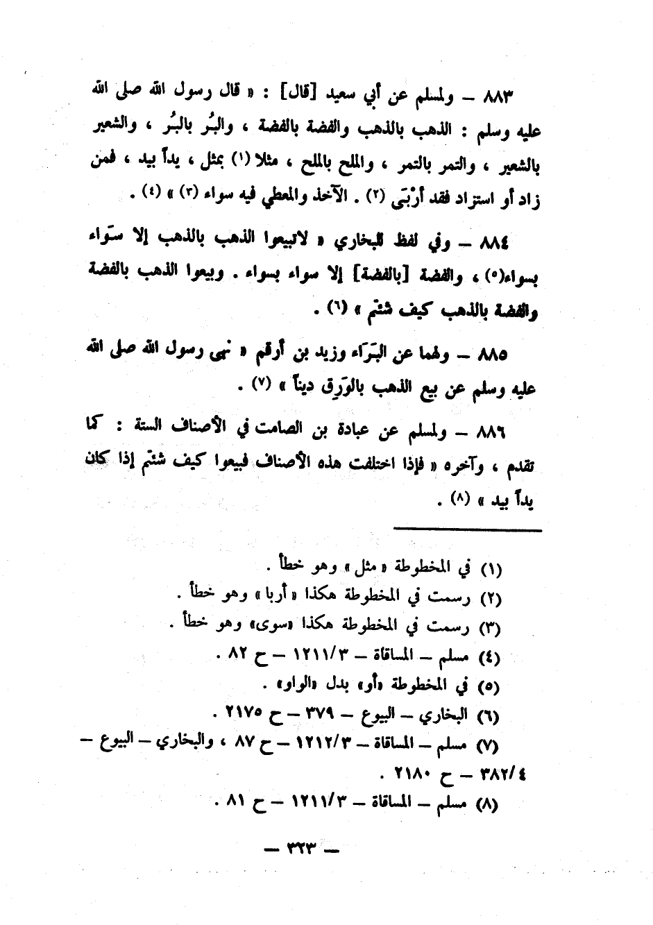 884- وفي لفظ للبخاري: "لا تبيعوا الذهب بالذهب إلا سَواء بسواء، 5 والفضة [بالفضة] إلا سواء بسواء. وبيعوا الذهب بالفضة والفضة بالذهب كيف شئتم" 6.