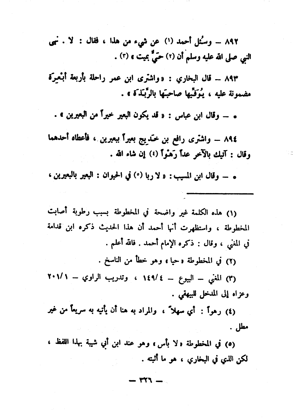 893- قال البخاري: "واشترى ابن عمر راحلة بأربعة أبْعِرَة مضمونة عليه، يُوَفِّيها صاحبَها بالرَّبَذَة. - وقال ابن عباس: قد يكون البعير خيراً من البعيرين".