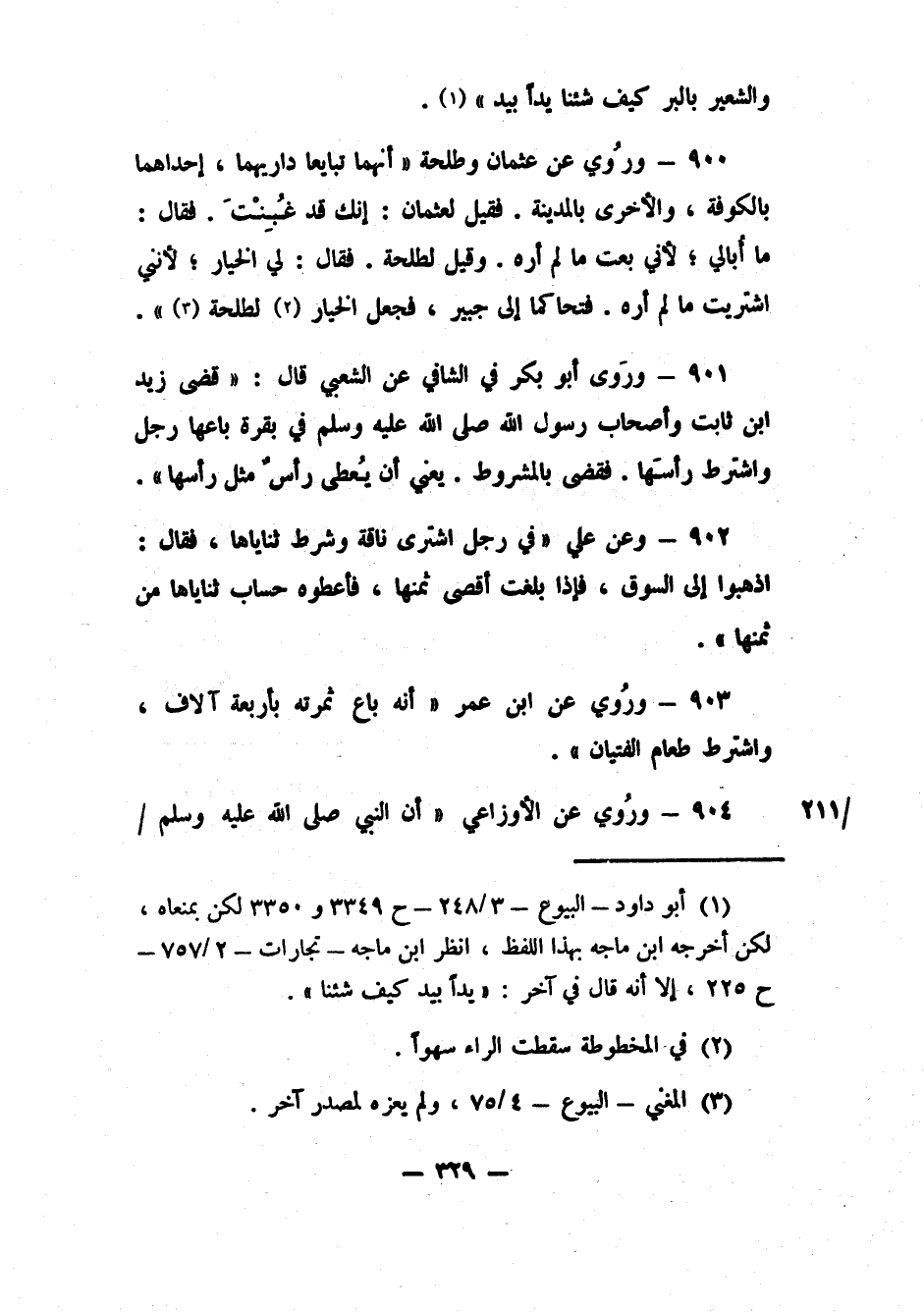 901- ورَوَى أبو بكر في الشافي عن الشعبي قال: "قضى زيد بن ثابت وأصحاب رسول الله صلى الله عليه وسلم في بقرة باعها رجل واشترط رأسَها. فقضى بالمشروط. يعني أن يُعْطَى رأسٌ مثل رأسها. ".