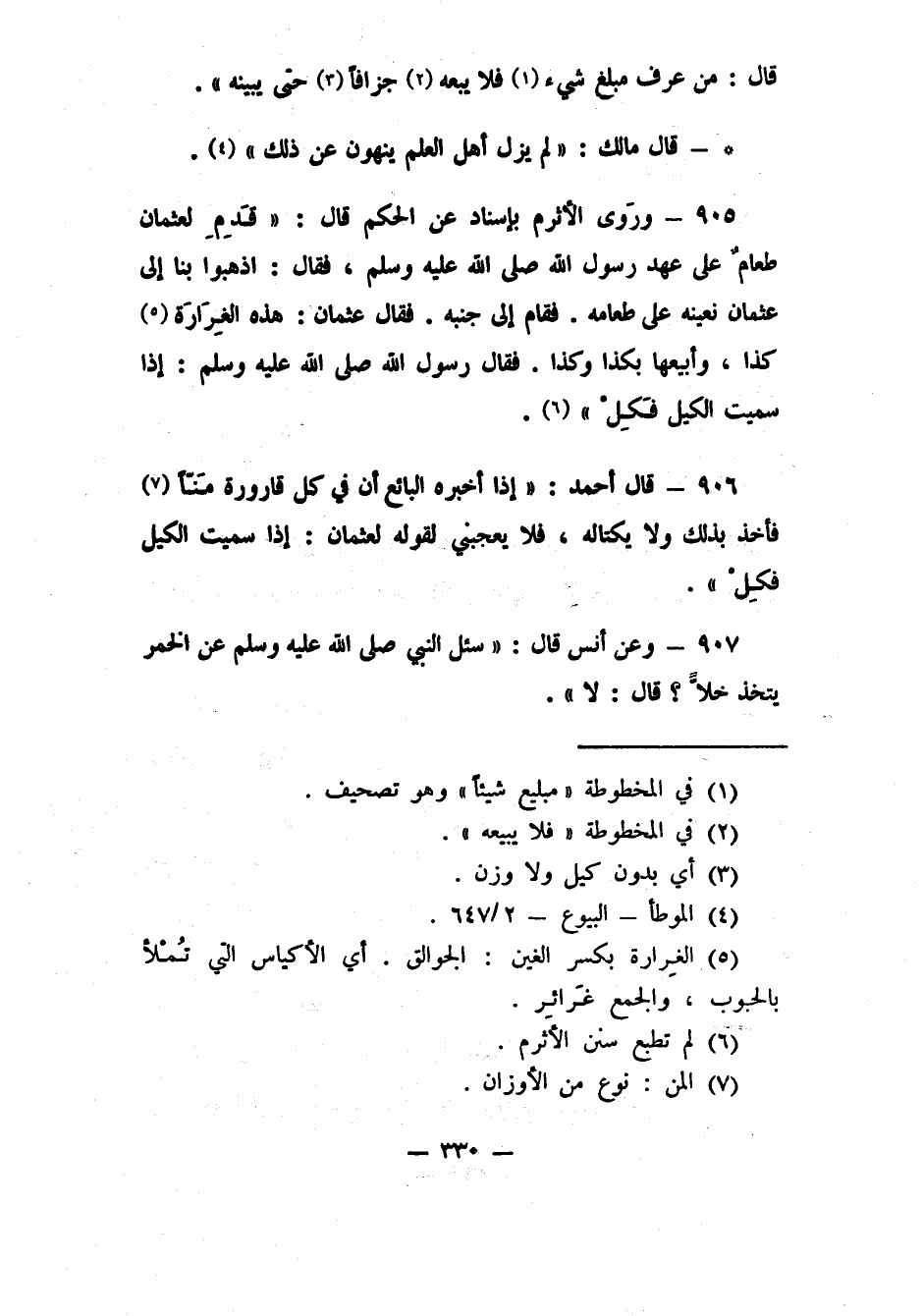 905- ورَوَى الأثرم بإسناد عن الحكم قال: "قَدِمَ لعثمان طعامٌ على عهد رسول الله صلى الله عليه وسلم فقال: اذهبوا بنا إلى عثمان نعينه على طعامه. فقام إلى جنبه. فقال عثمان: هذه الغِرَارَة5 كذا، وأبيعها بكذا وكذا. فقال رسول الله صلى الله عليه وسلم إذا سميت الكيل فكِلْ" 6.