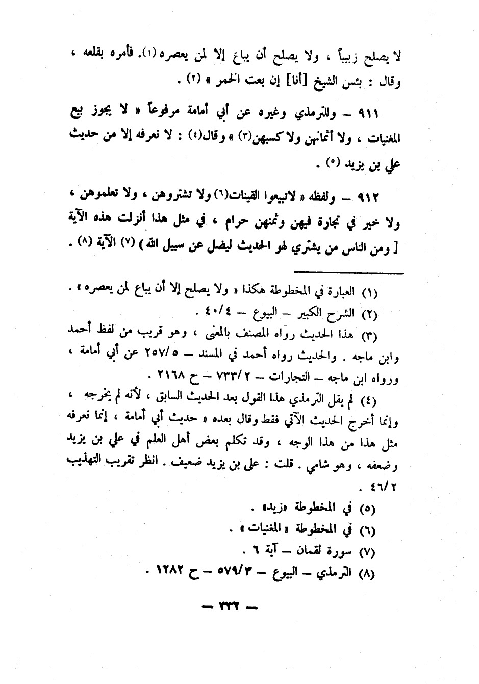 911- وللترمذي وغيره عن أبي أمامة مرفوعاً: "لا يجوز بيع المغنيات، ولا أثمانهن ولا كسبهن 3" وقال:4 لا نعرفه إلا من حديث علي بن يزيد 5.