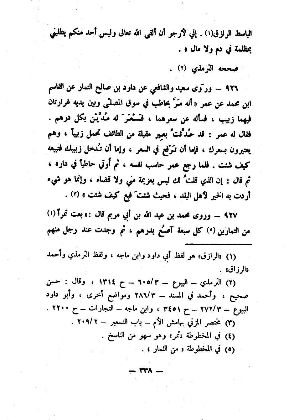 926- ورَوى سعيد والشافعي عن داود بن صالح التمار عن القاسم ابن محمد عن عمر "أنه مَرَّ بحاطب في سوق المصلّى وبين يديه غرارتان فيهما زبيب، فسأله عن سعرهما، فسعَّر له مُدَّيْن بكل درهم. فقال له عمر: قد حُدِّثْتُ بِعِيْرٍ مقبلة من الطائف تحمل زبيباً، وهم يعتبرون بسعرك، فإما أن تَرْفَع في السعر وإما أن تُدْخِل زبيبك فتبيعه كيف شئت. فلما رجع عمر حاسب نفسه، ثم أَتَى حاطباً في داره ثم قال: إن الذي قلتُ لك ليس بعزيمة مني ولا قضاء، وإنما هو شيء أردت به الخير لأهل البلد، فحيث شئتَ فبع كيف شئت"3.