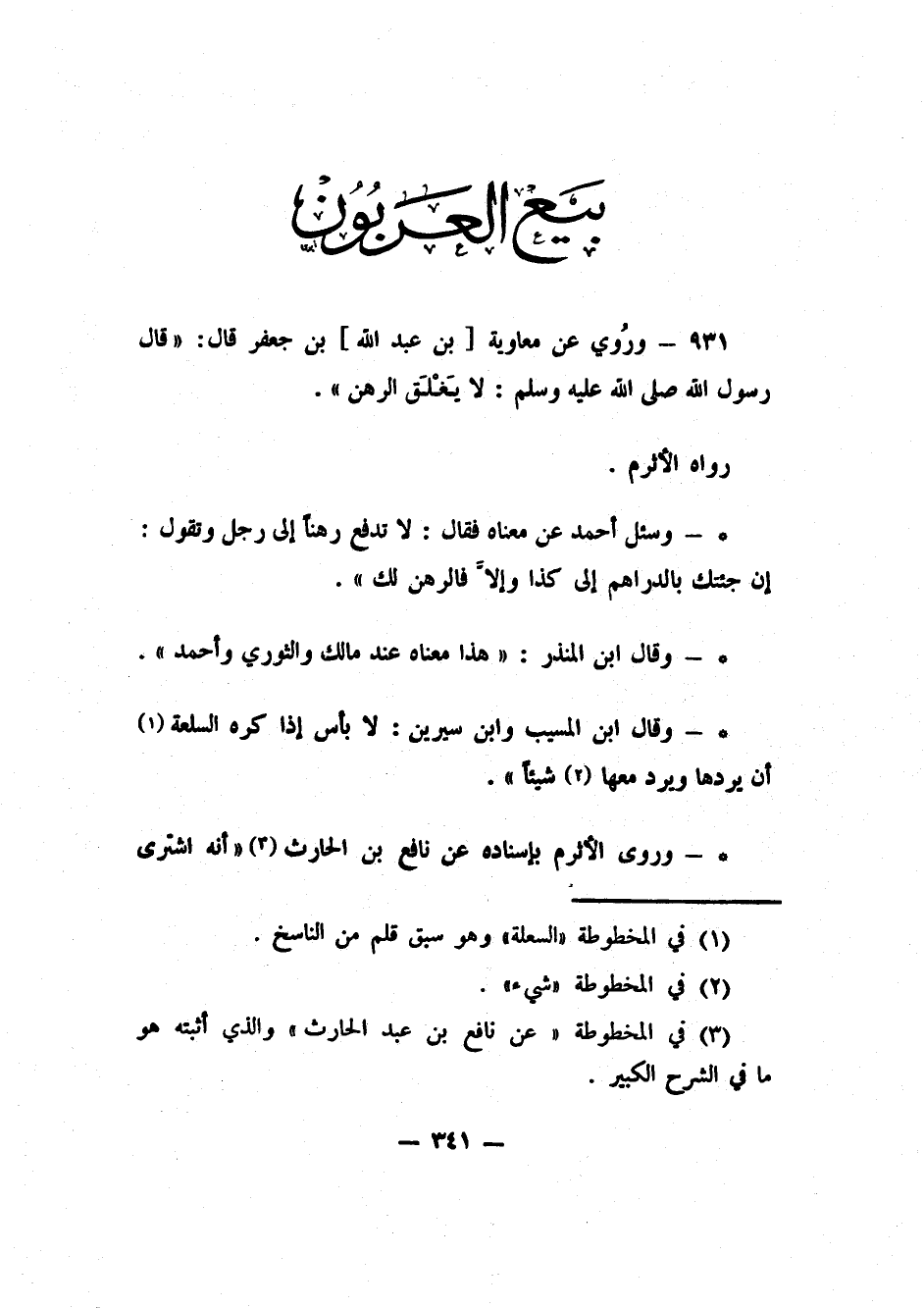 931- ورُوي عن معاوية [بن عبد الله] بن جعفر قال: قال رسول الله صلى الله عليه وسلم: "لا يَغْلَق الرهن". رواه الأثرم.