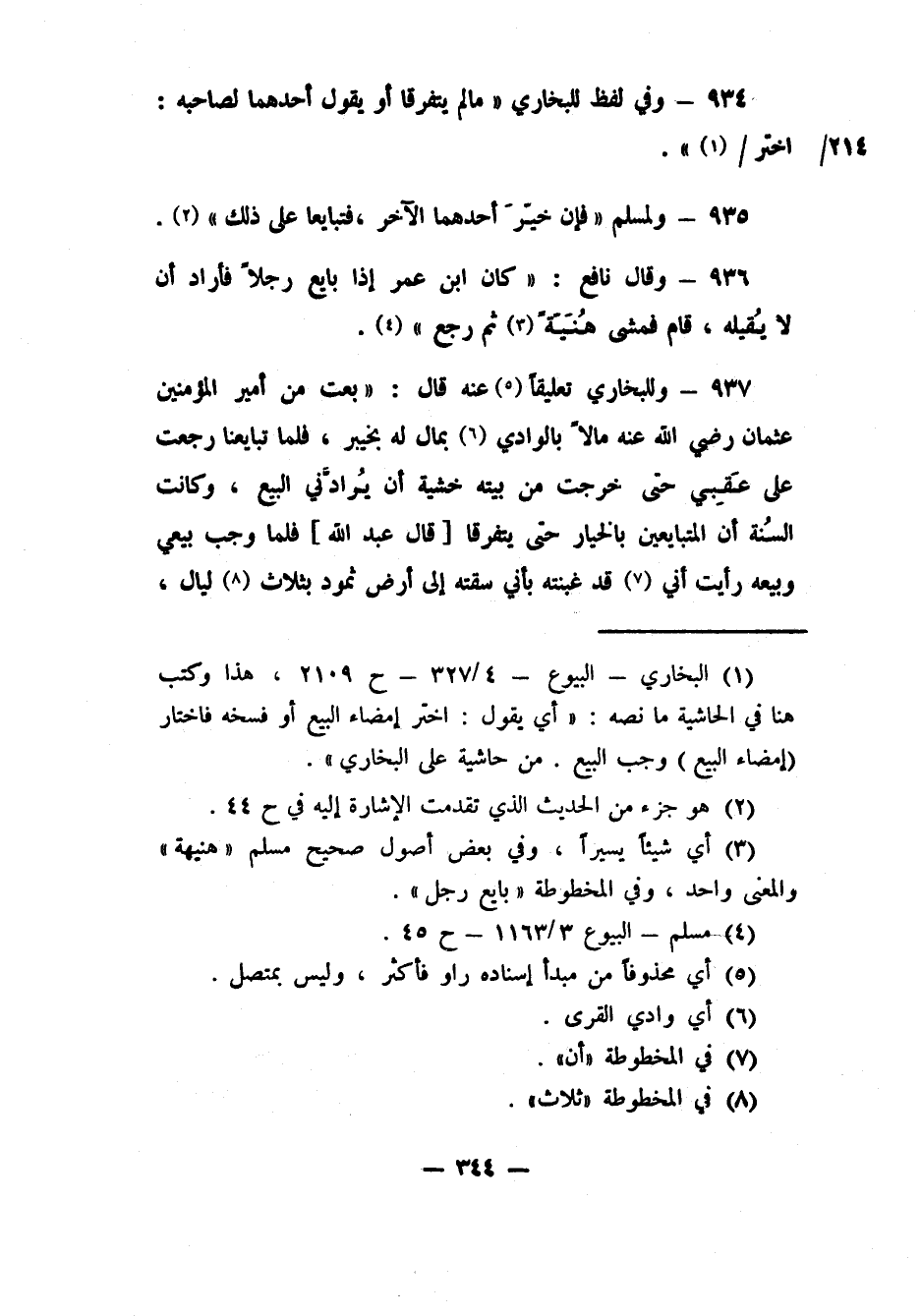 937- وللبخاري تعليقاً5 عنه قال: (بعت من أمير المؤمنين عثمان رضي الله عنه مالاً بالوادي6 بمال له بخيبر، فلما تبايعنا رجعت على عَقِبِي حتى خرجت من بيته خشية أن يُرادَّني البيع، وكانت السُنة أن المتبايعين بالخيار حتى يتفرقا. [قال عبد الله] : فلما وجب بيعي وبيعه رأيت أني7 قد غبنته بأني سقته إلى أرض ثمود بثلاث8 ليال