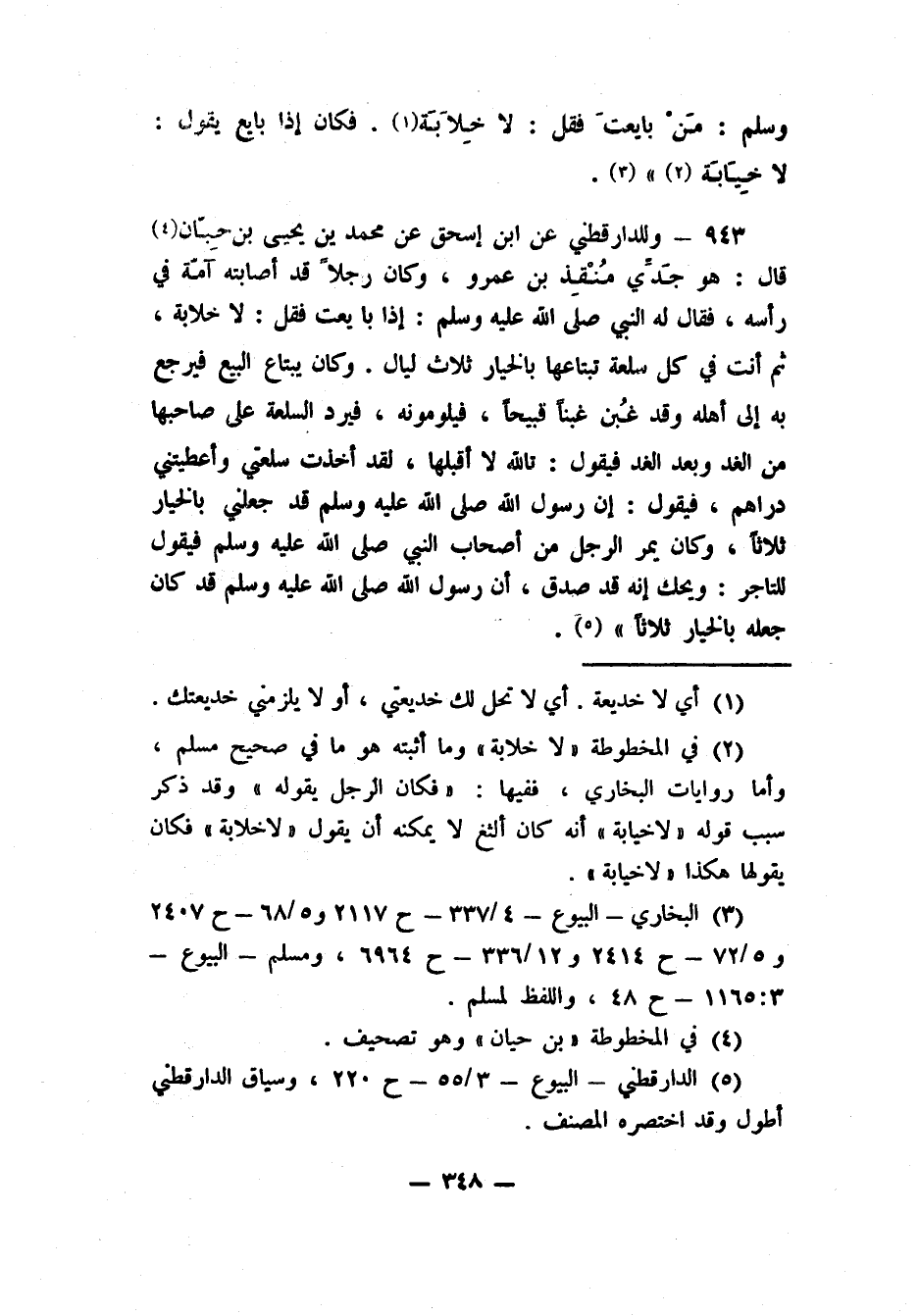 943- وللدارقطني عن ابن إسحاق عن محمد بن يحيى بن حِبَّان4 قال: هو جَدِّي مُنْقِذ بن عمرو، وكان رجلاً قد أصابته آمّة في رأسه، فقال له النبي: صلى الله عليه وسلم "إذا بايعت فقل: لا خلابة، ثم أنت في كل سلعة تبتاعها بالخيار ثلاث ليال. " وكان يبتاع البيع فيرجع به إلى أهله وقد غُبن غبناً قبيحاً، فيلومونه، فيرد السلعة على صاحبها من الغد وبعد الغد فيقول: تالله لا أقبلها، لقد أخذت سلعتي وأعطيتني دراهم، فيقول: أن رسول الله صلى الله عليه وسلم قد جعلني بالخيار ثلاثاً، وكان يمر الرجل من أصحاب النبي صلى الله عليه وسلم فيقول للتاجر: ويحك إنه قد صدق "أن رسول الله صلى الله عليه وسلم قد كان جعله بالخيار ثلاثا"5.
