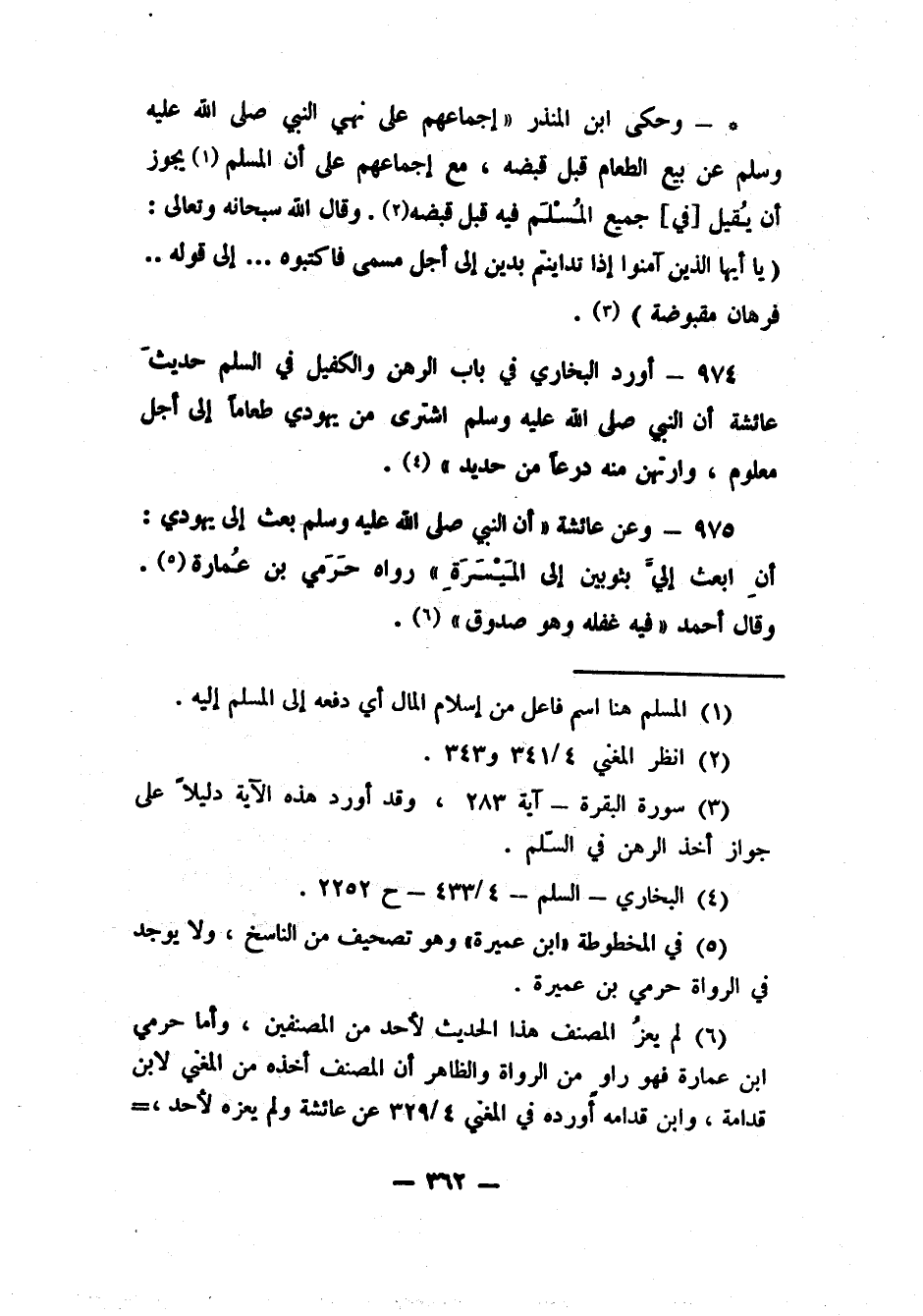 975- وعن عائشة: "أن النبي صلى الله عليه وسلم بعث إلى يهودي: أنِ ابعث إليَّ بثوبين إلى الْمَيْسَرَة" رواه حَرَمي بن عُمارة.6 وقال أحمد فيه غفله وهو صدوق 7.