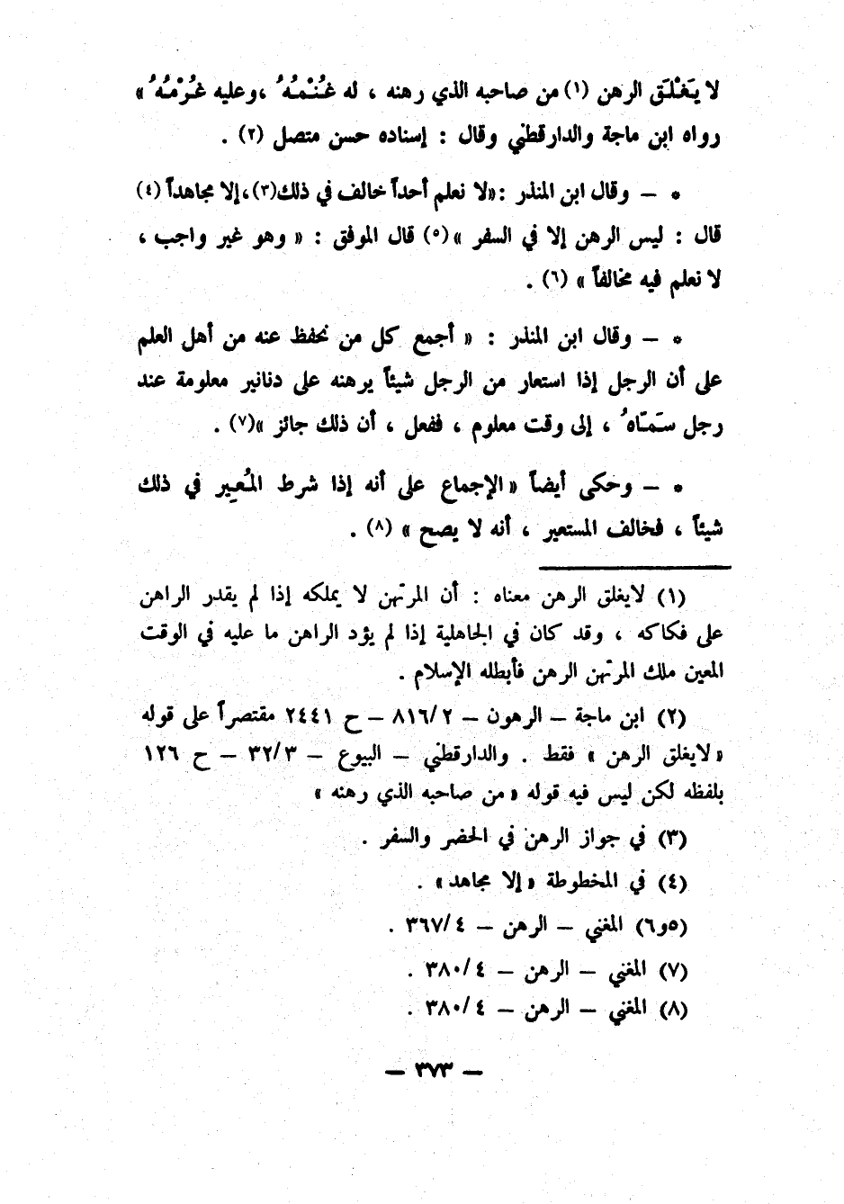 : "لا يَغْلَق الرهن 1 من صاحبه الذي رهنه، له غُنْمُهُ، وعليه غُرْمُهُ" رواه ابن ماجة والدارقطني وقال: إسناده حسن متصل 2.