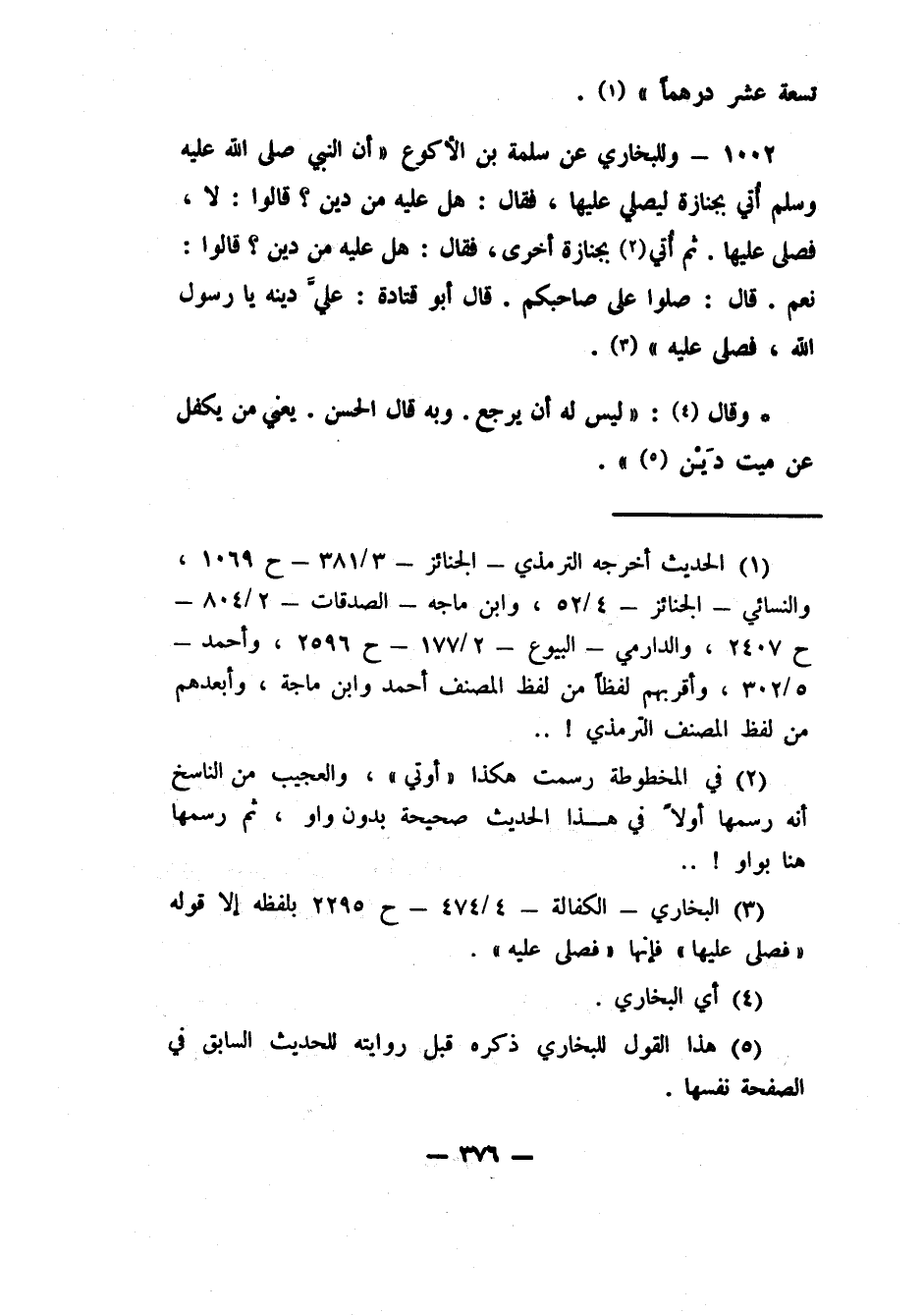 1002- وللبخاري عن سلمة بن الأكوع: "أن النبي صلى الله عليه وسلم أُتِيَ بجنازة ليصلي عليها، فقال: هل عليه من ديْن؟ قالوا: لا، فصلى عليها. ثم أُتِيَ2 بجنازة أخرى، فقال: هل عليه من ديْن؟ قالوا: نعم. قال: صلوا على صاحبكم. قال أبو قتادة: عليَّ دينه يا رسول الله، فصلى عليه3") وقال:4 ليس له أن يرجع. وبه قال الحسن. يعني من يكفل عن ميت دينا 5.