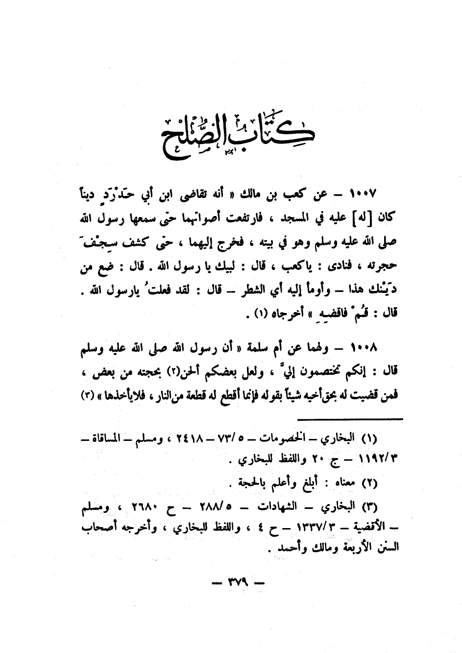 1007- عن كعب بن مالك "أنه تقاضى ابن أبي حَدْرَد دَيْناً كان [له] عليه في المسجد فارتفعت أصواتهما حتى سمعها رسول الله صلى الله عليه وسلم وهو في بيته، فخرج إليهما، حتى كشف سِجْفَ حجرته، فنادى: يا كعب، قال: لبيك يا رسول الله. قال: ضع من دَيْنِك هذا - وأومأ إليه أي الشطر- قال: لقد فعلتُ يا رسول الله. قال: قُمْ فَاقْضِه" أخرجاه 1.