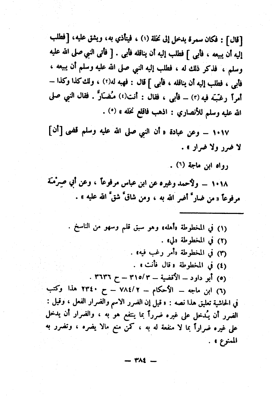 1017- وعن عبادة: "أن النبي، صلى الله عليه وسلم قضى [أن] لا ضرر ولا ضرار" رواه ابن ماجة 6.