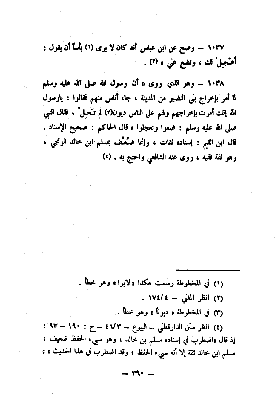 4 انظر سنن الدارقطني - البيوع - 3/46 - ح 190- 93: إذ قال: "اضطرب في إسناده مسلم بن خالد, وهو سيئ الحفظ ضعيف, مسلم بن خالد ثقة إلا أنه سيئ الحفظ, وقد اضطرب في هذا الحديث":.