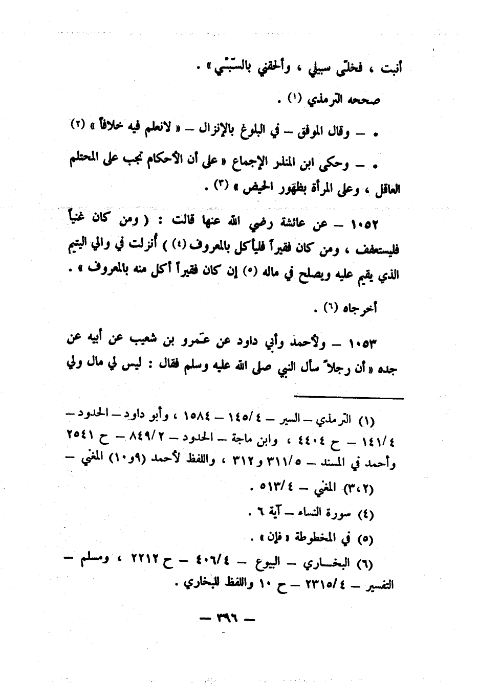 1052- عن عائشة رضي الله عنها قالت: ?" {وَمَنْ كَانَ غَنِيّاً فَلْيَسْتَعْفِفْ وَمَنْ كَانَ فَقِيراً فَلْيَأْكُلْ بِالْمَعْرُوفِ} 4 أُنْزِلت في والي اليتيم الذي يقيم عليه ويصلح في ماله5، إن كان فقيراً أكل منه بالمعروف" أخرجاه 6.